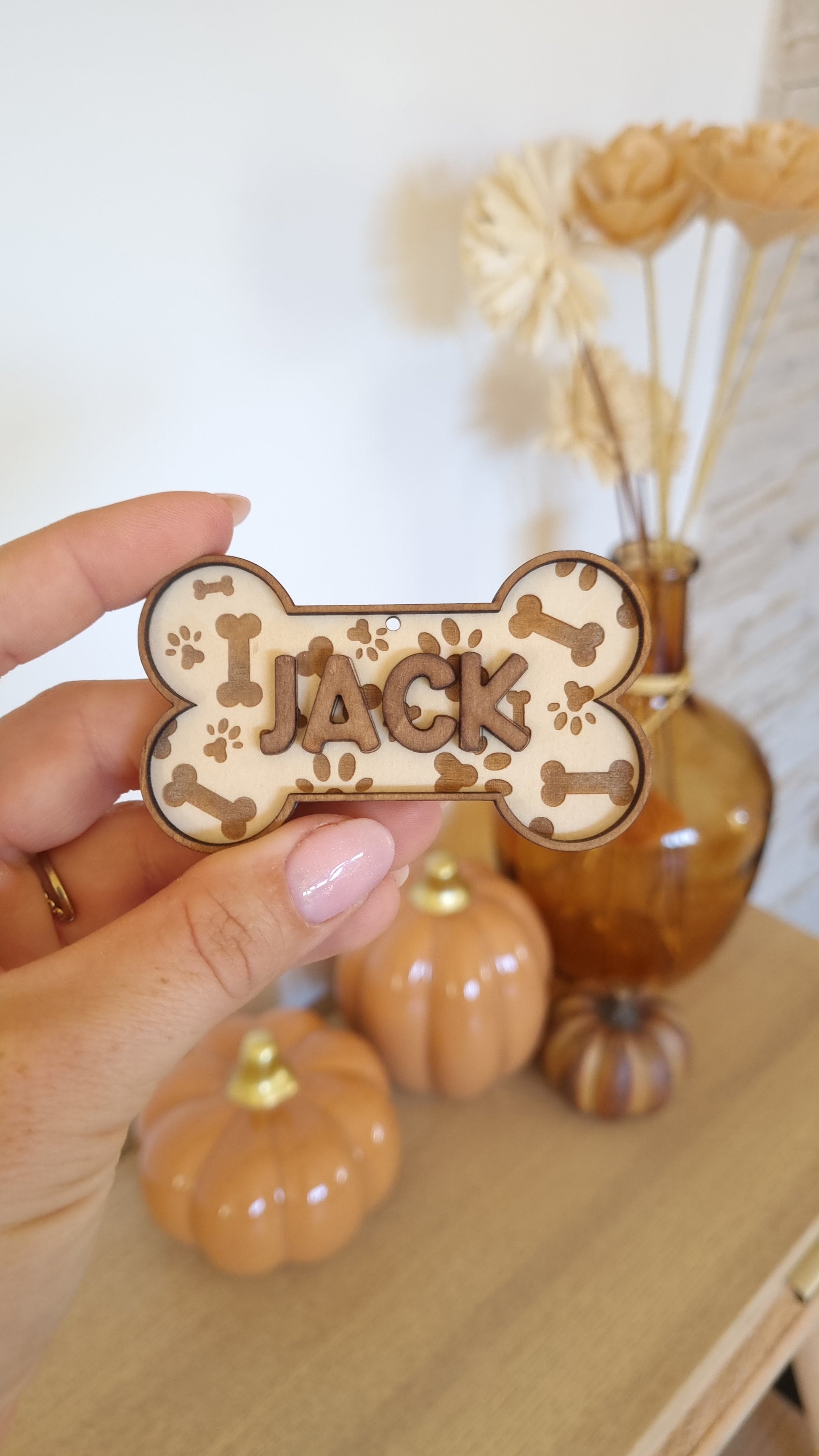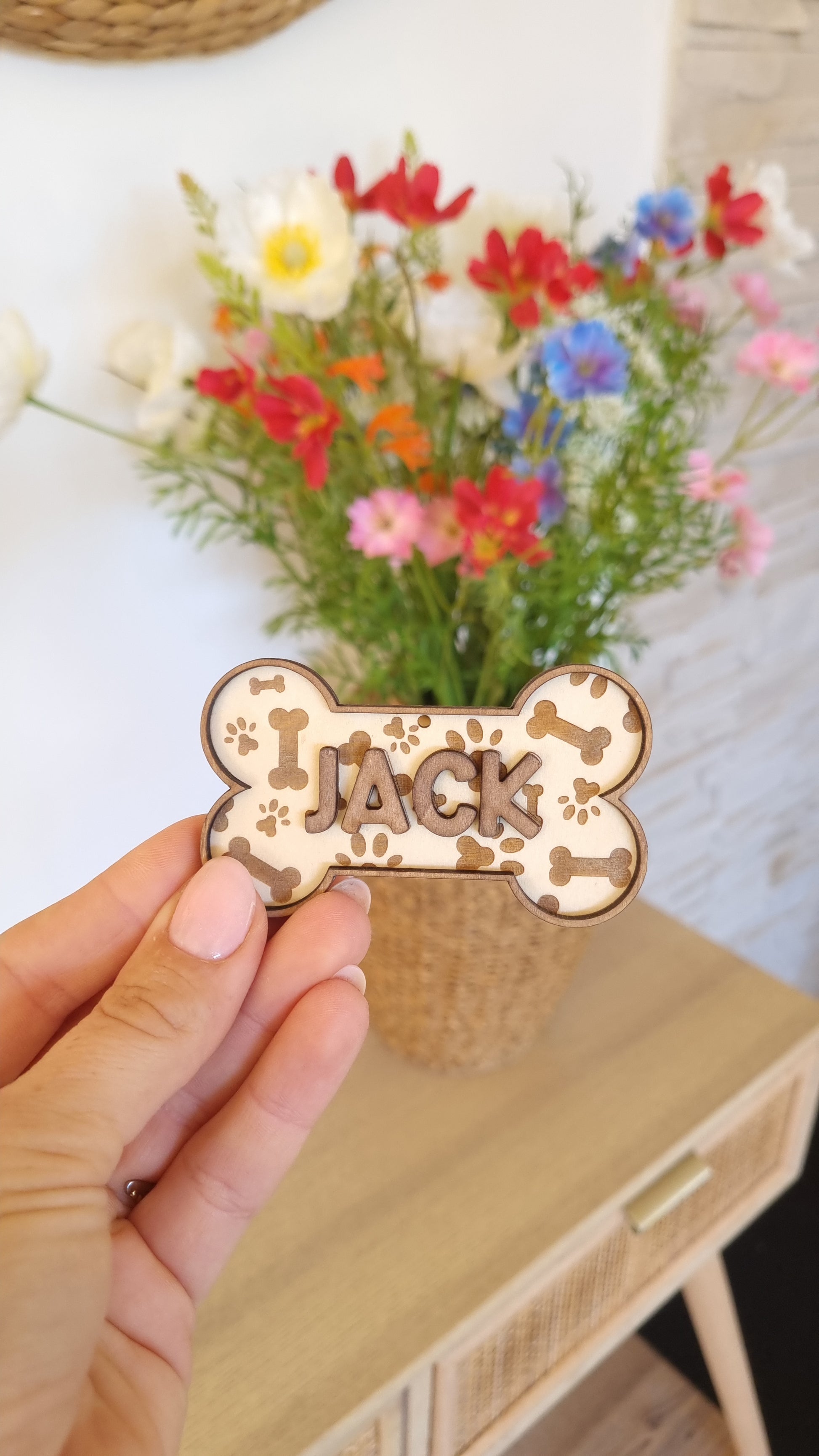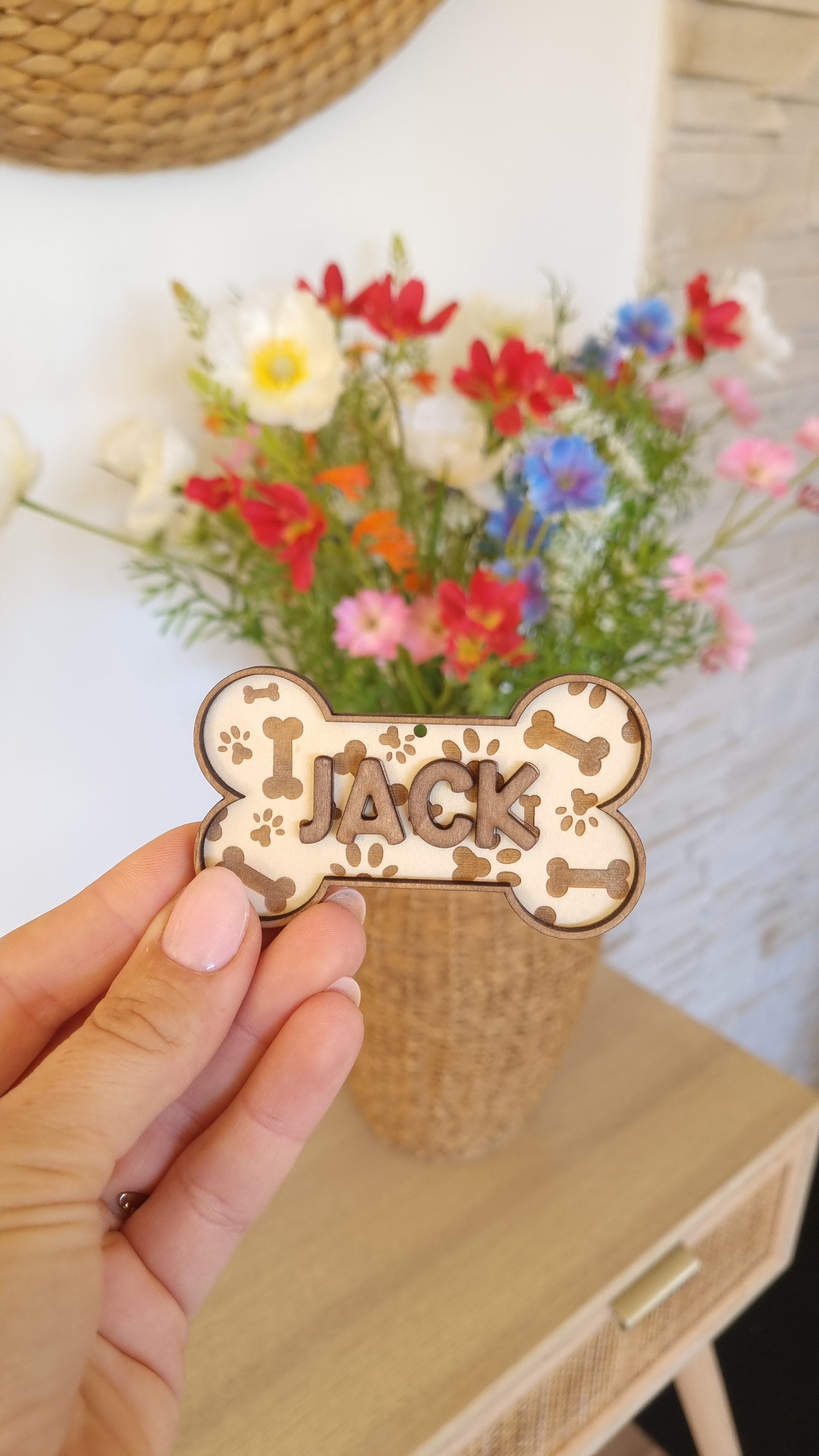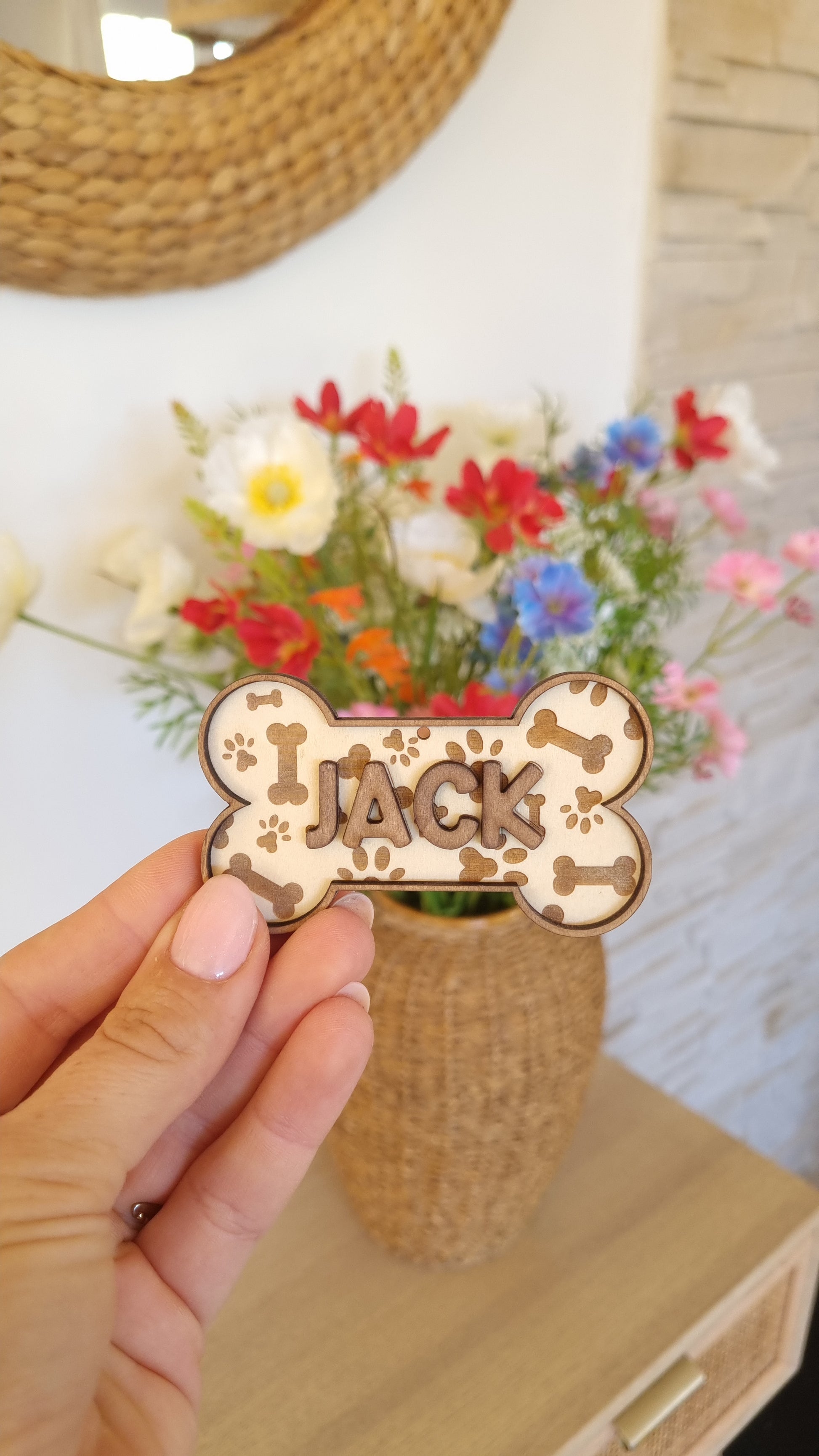 Chaque pièce est personnalisée avec le prénom de votre chien, gravé avec soin et teinté à la broue de noix pour un rendu naturel et chaleureux.