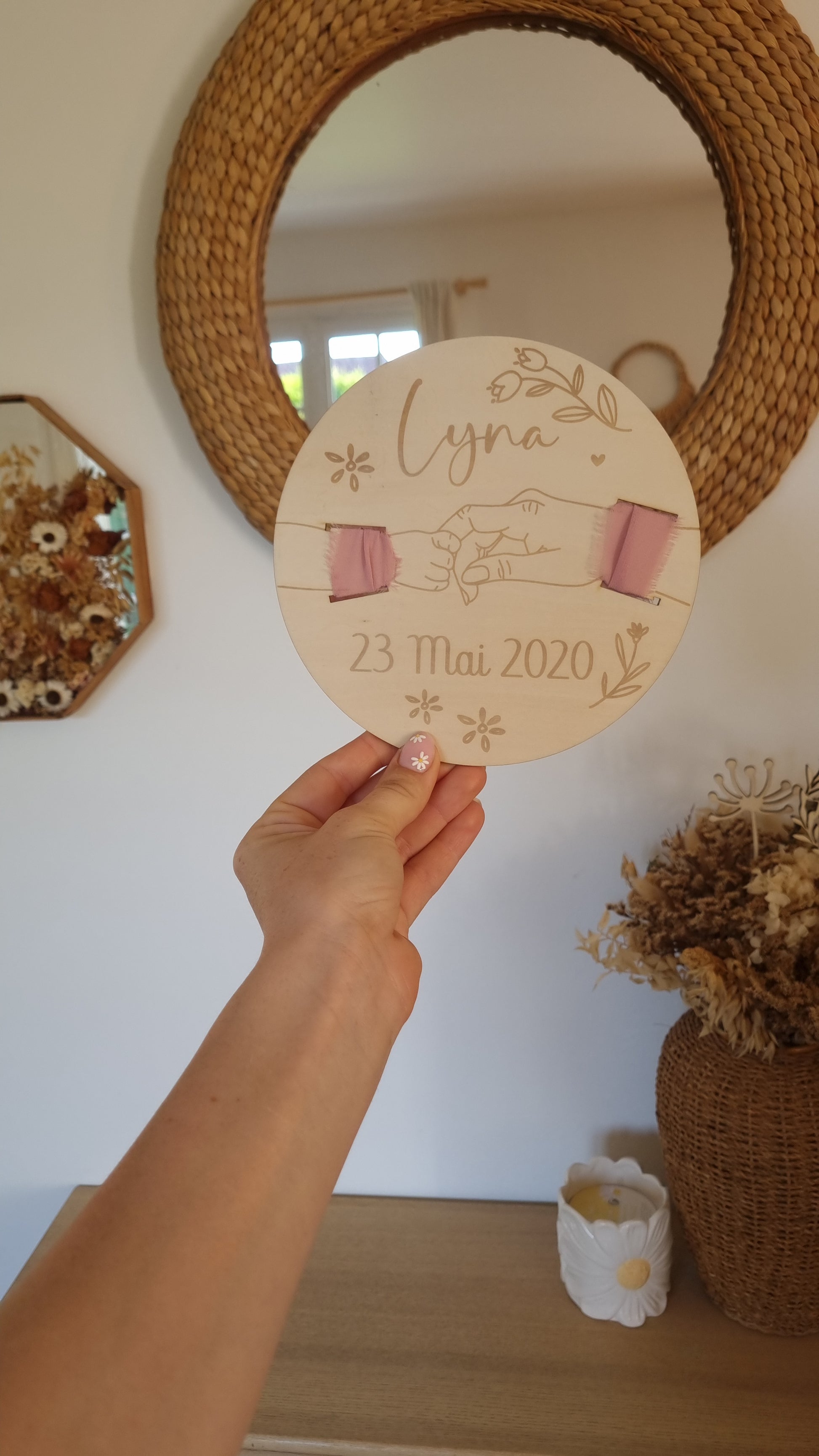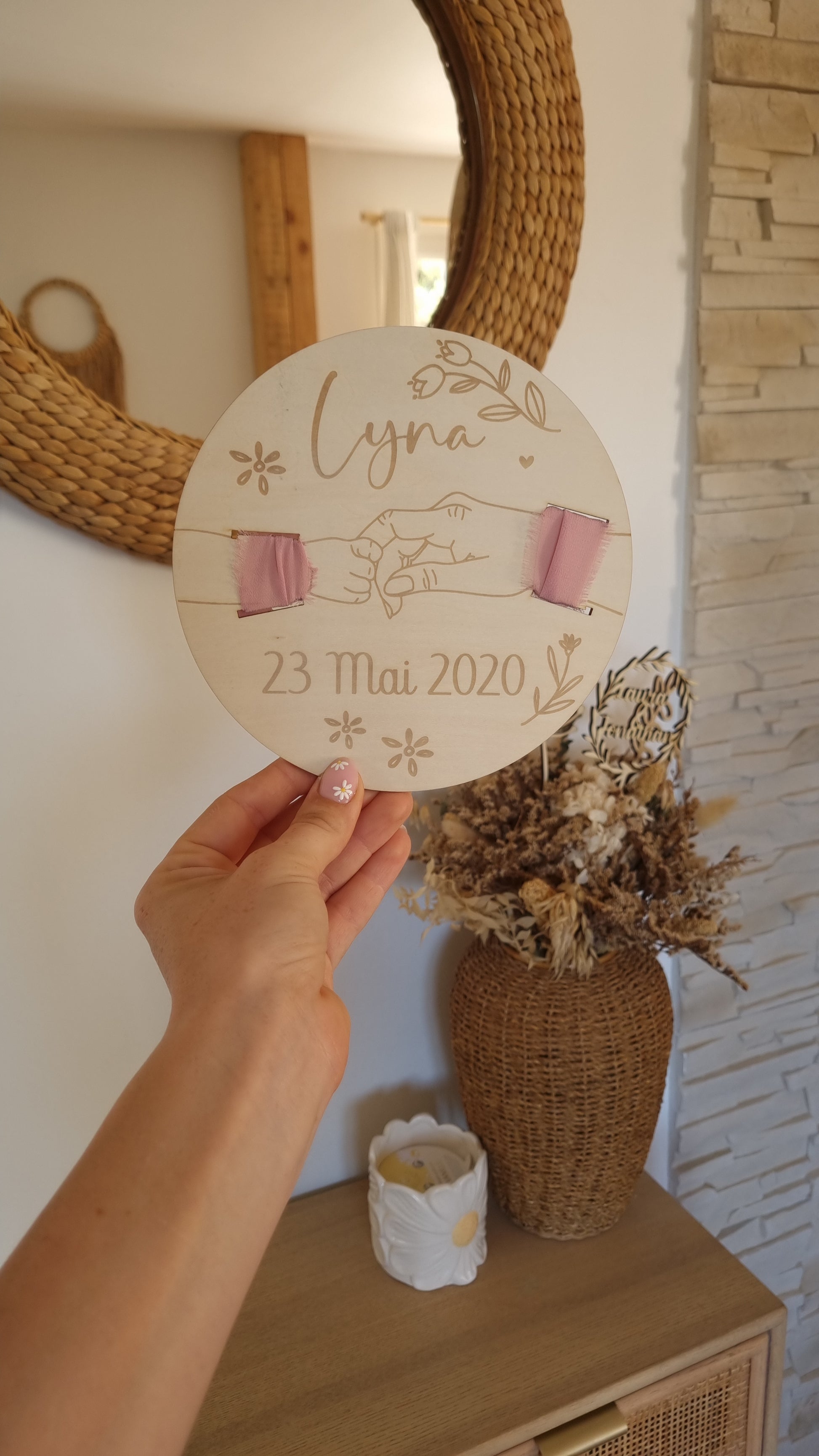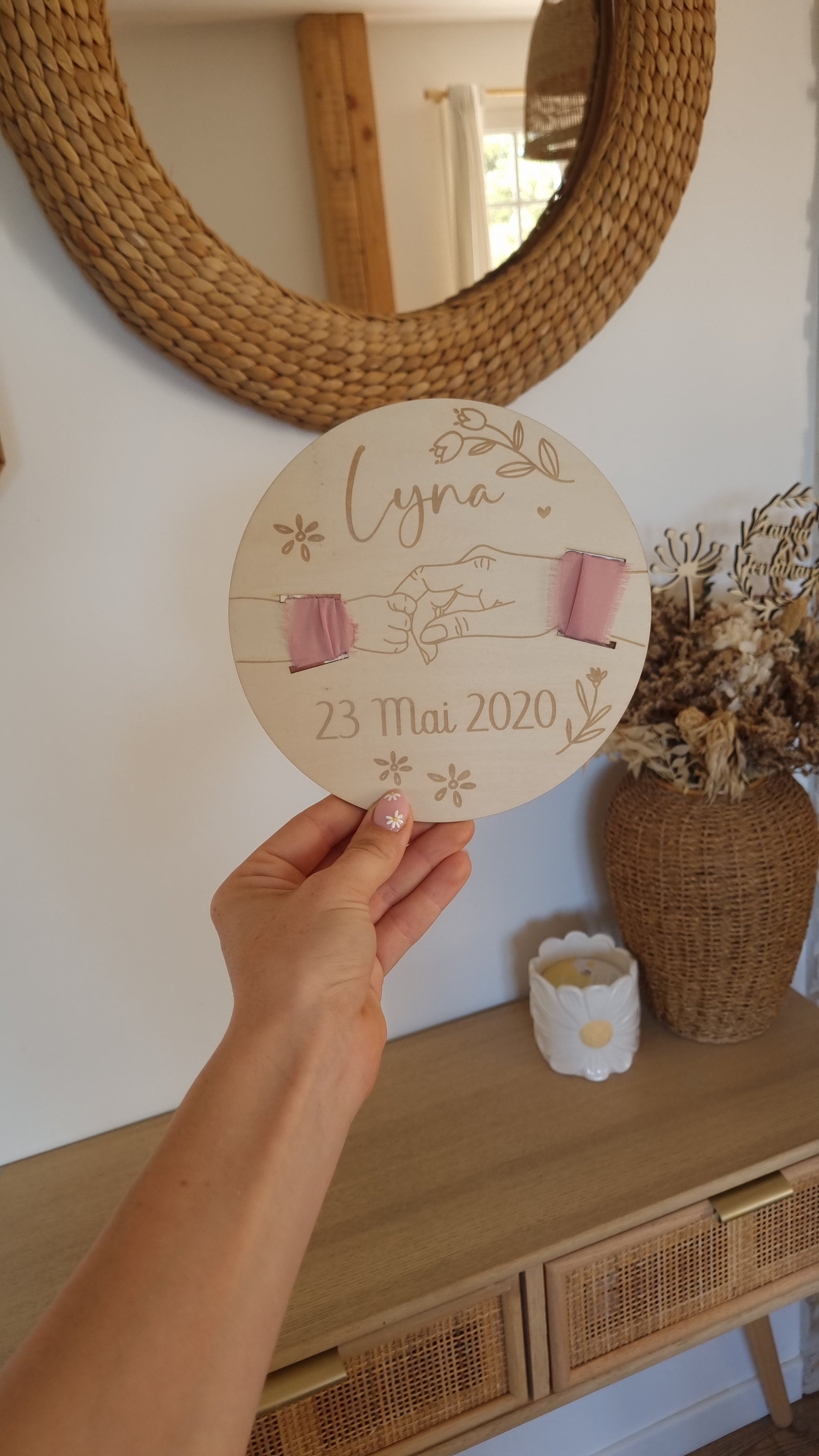Immortalisez le plus beau jour de votre vie avec ce support en bois personnalisé en forme de rond (environ 17 cm de diamètre), spécialement conçu pour exposer les précieux bracelets de naissance de la maman et du bébé.