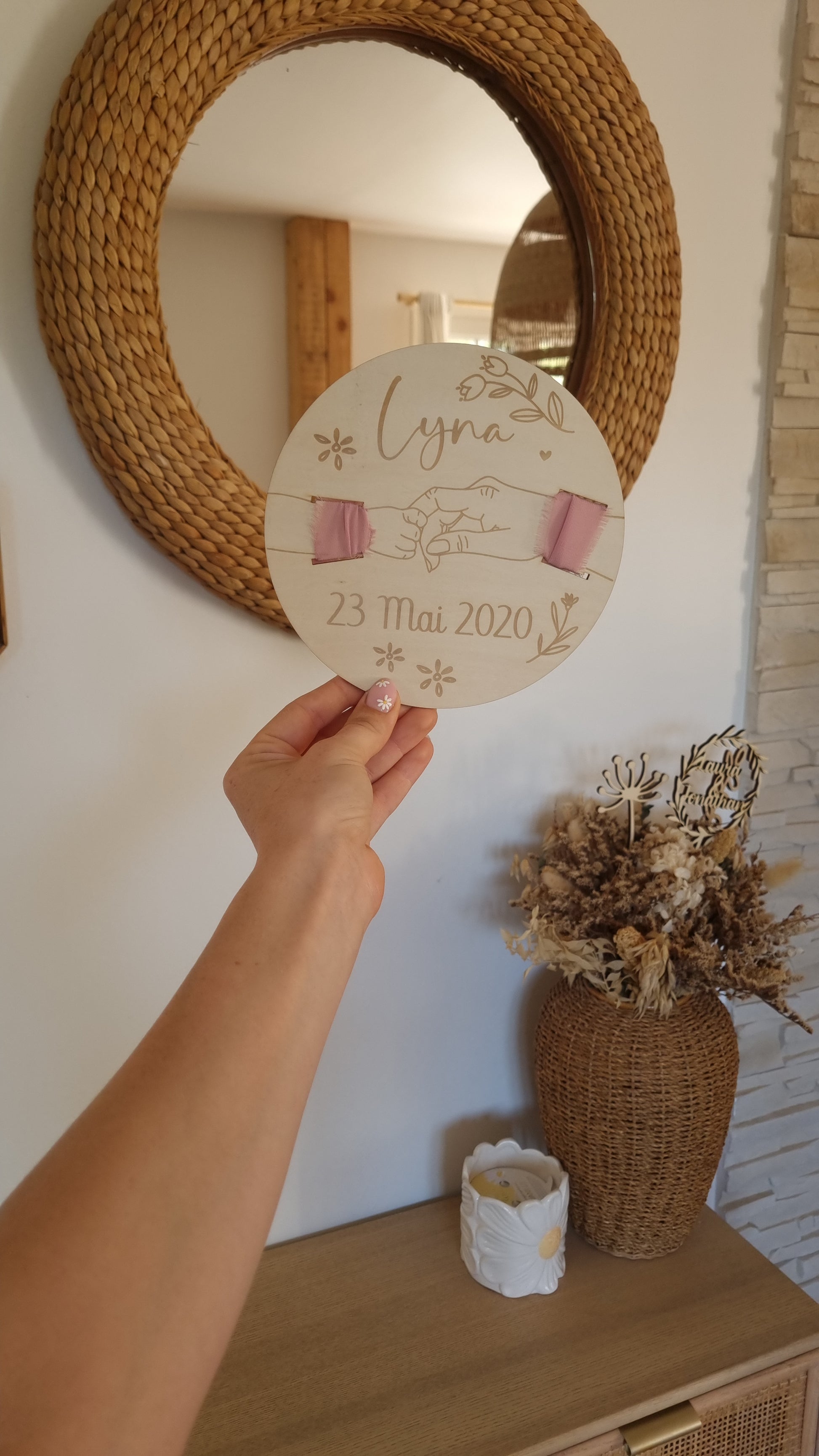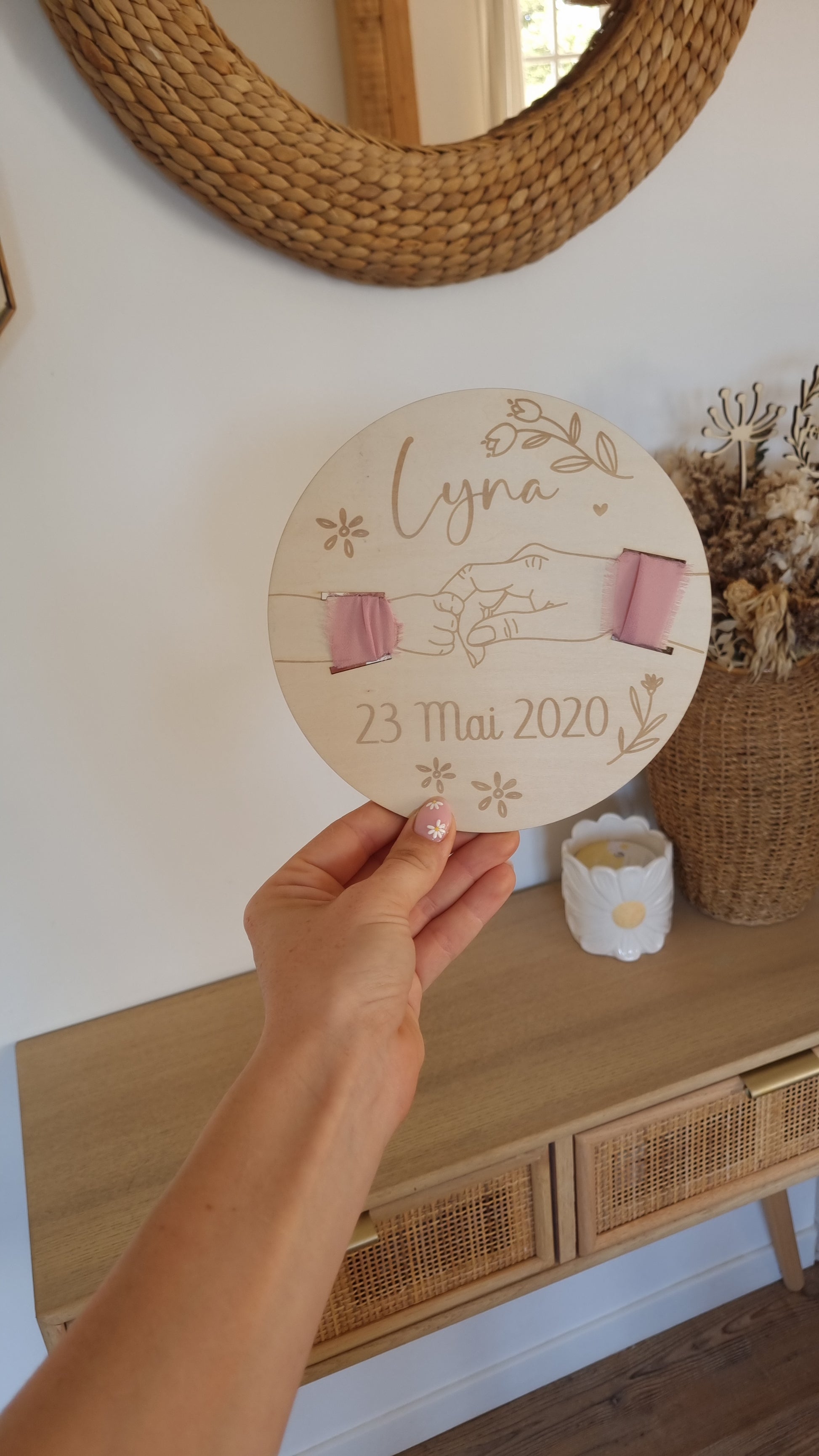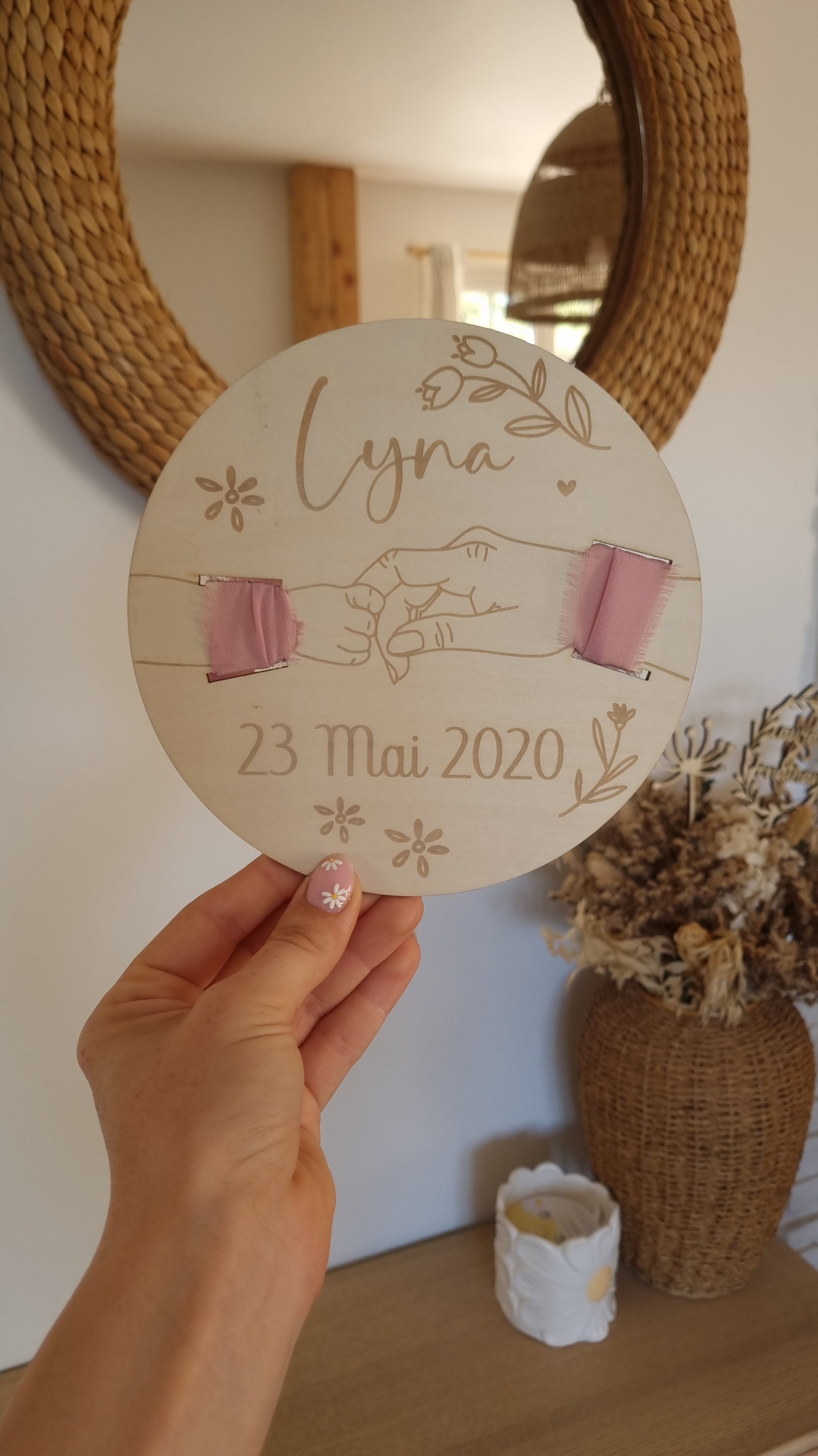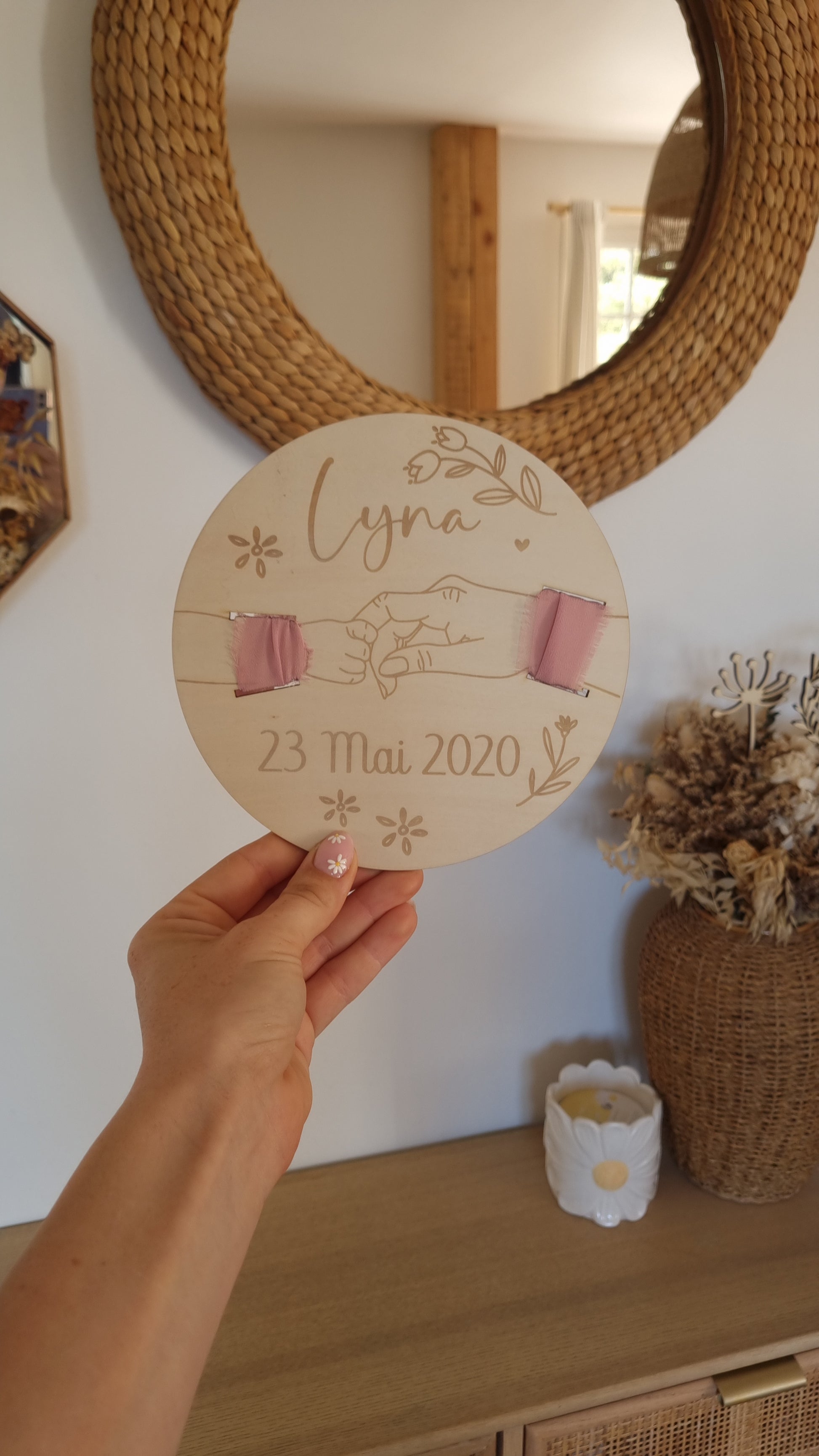 Immortalisez le plus beau jour de votre vie avec ce support en bois personnalisé en forme de rond (environ 17 cm de diamètre), spécialement conçu pour exposer les précieux bracelets de naissance de la maman et du bébé.