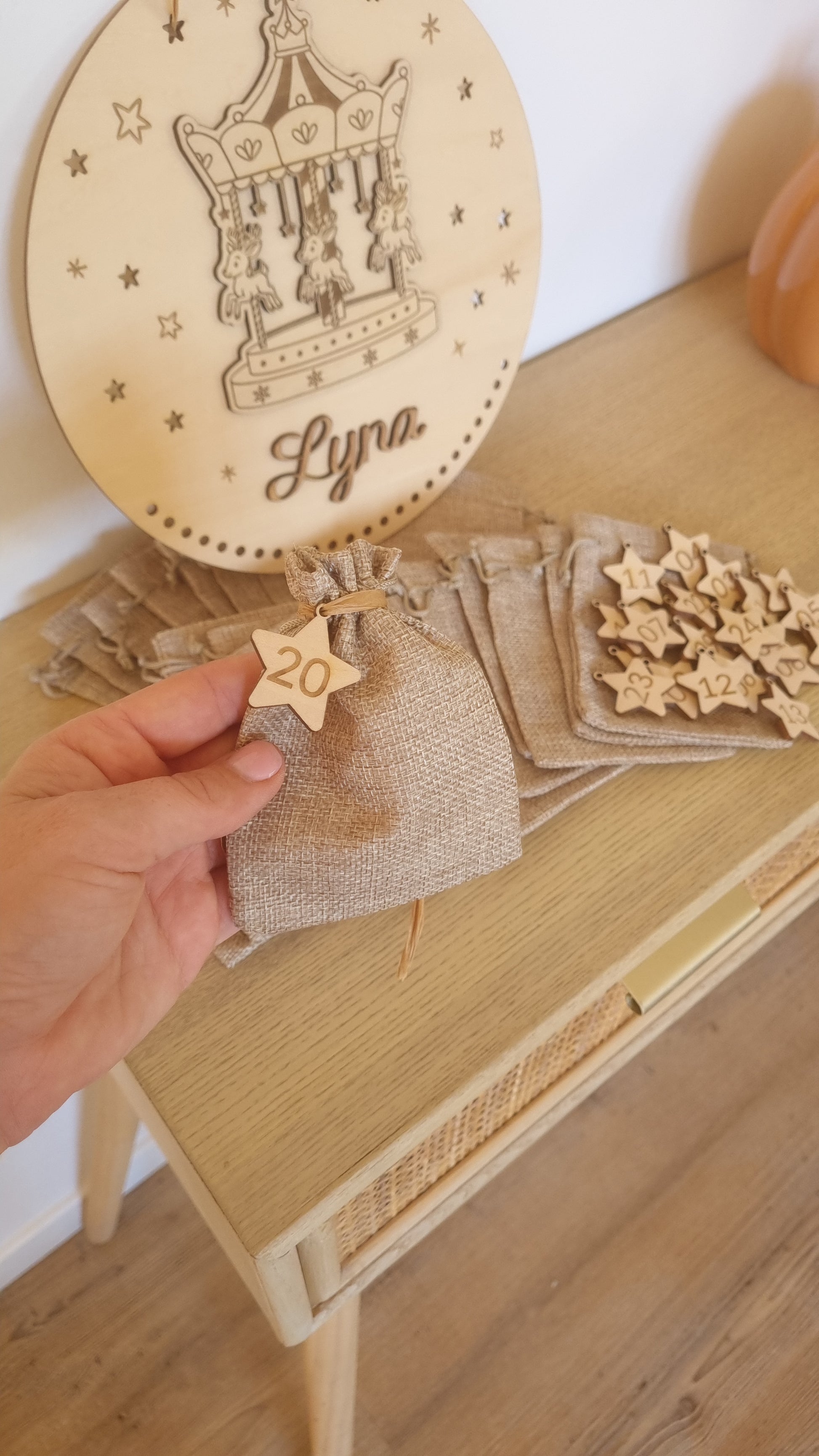 Kit complet : le calendrier + 24 cordes, 24 pochons, et 24 étoiles numérotées de 1 à 24, prêt à l’emploi