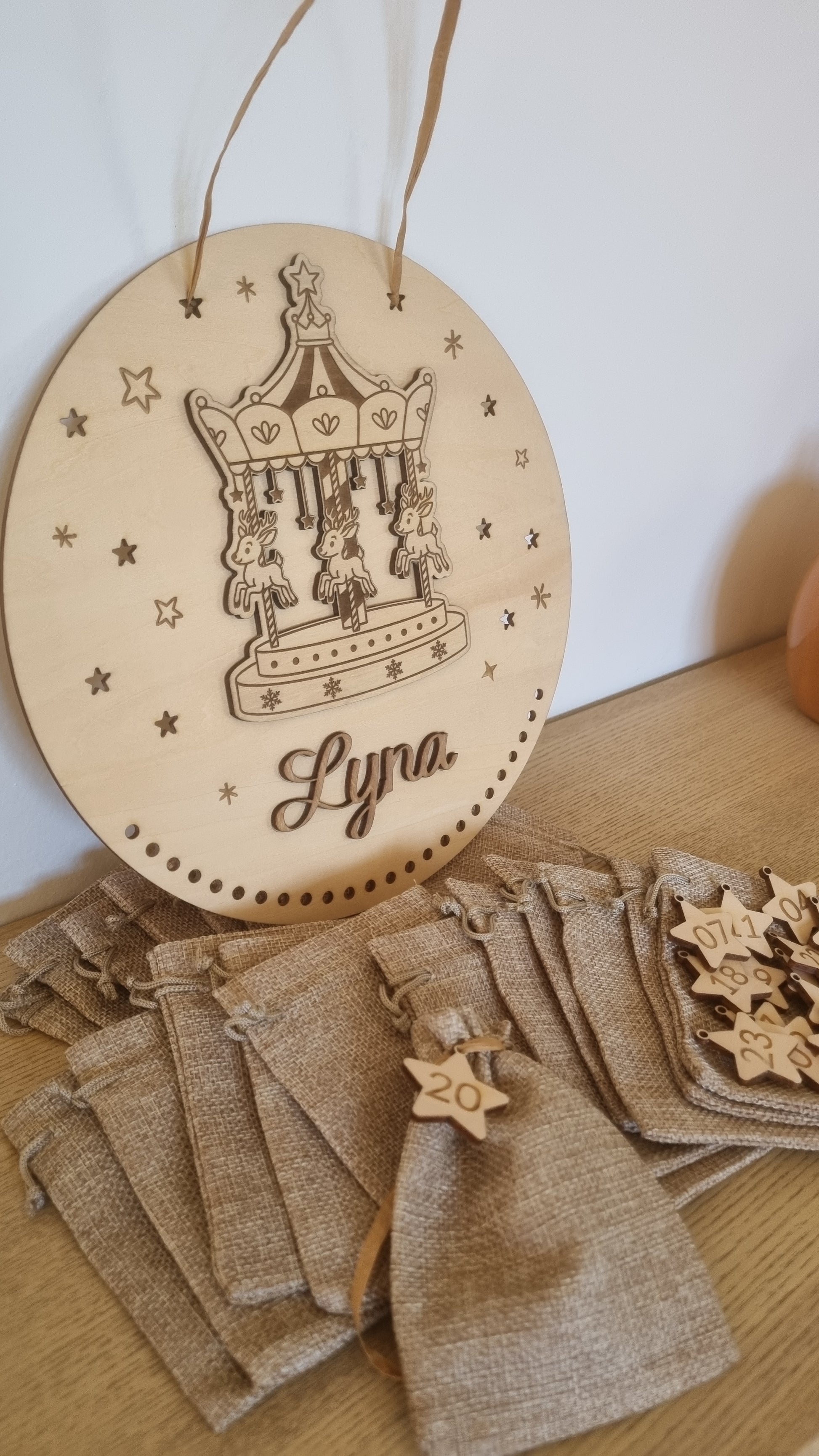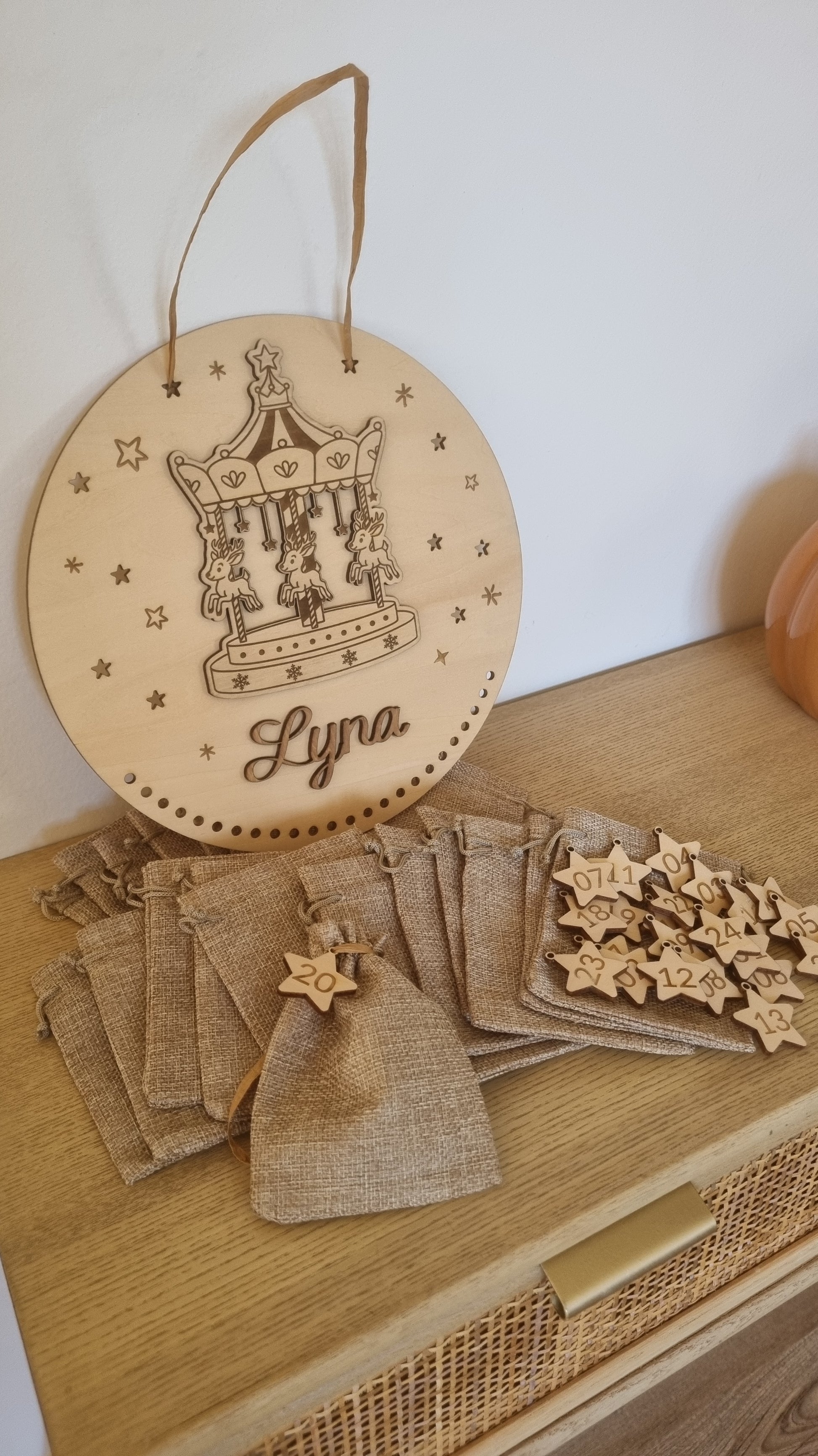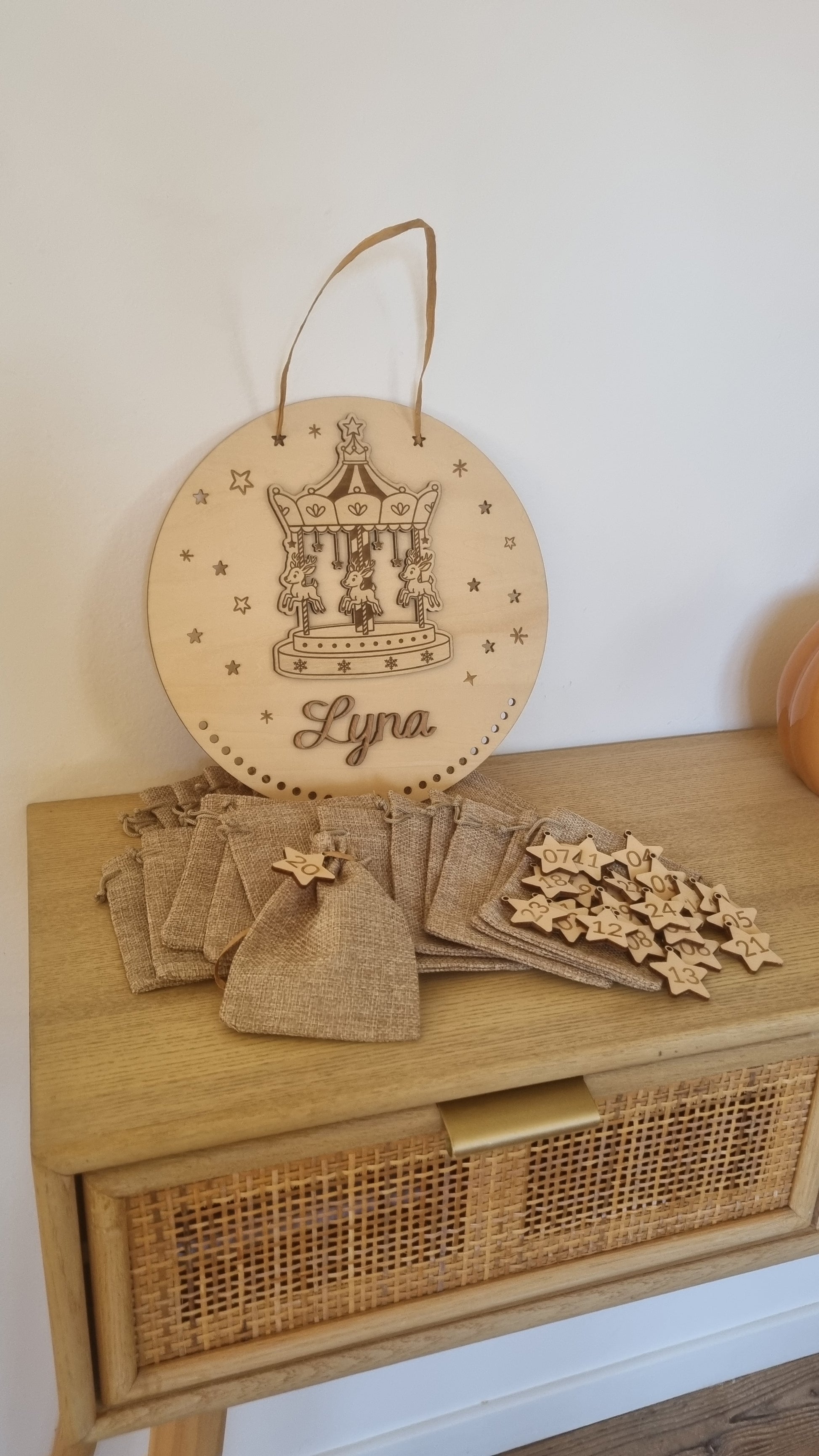 Ce calendrier mesure 25 cm de diamètre, Au centre, un manège en bois, et juste en dessous, v le prénom de l’enfant teinté au brou de noix pour une touche personnelle unique.
