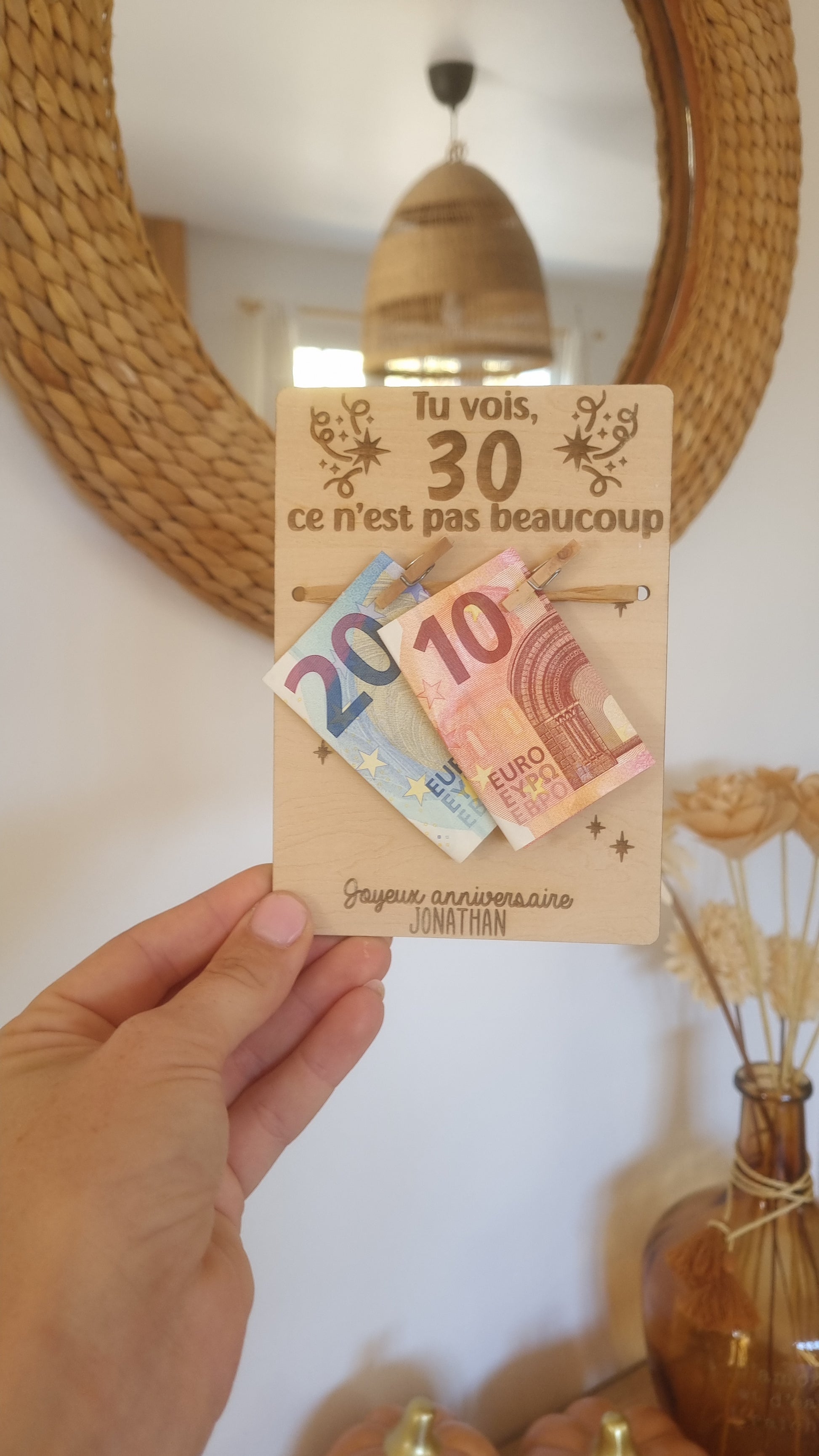 Carte anniversaire en bois personnalisée – Support billets avec pinces – Cadeau anniversaire original
