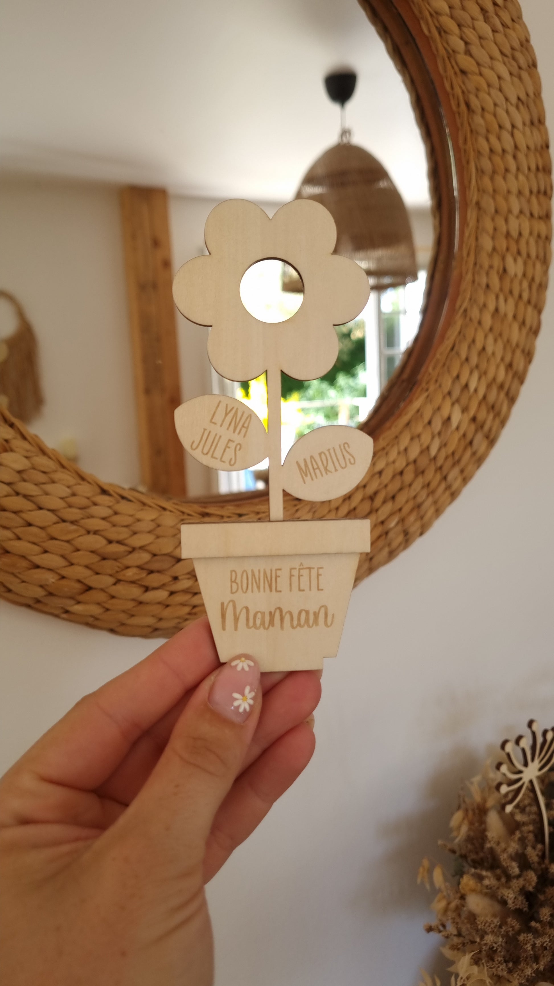 Notre fleur en bois à poser, gravée avec les prénoms des enfants, est une délicate attention à offrir pour la Fête des Mères, ou pour toute autre occasion remplie d’amour.