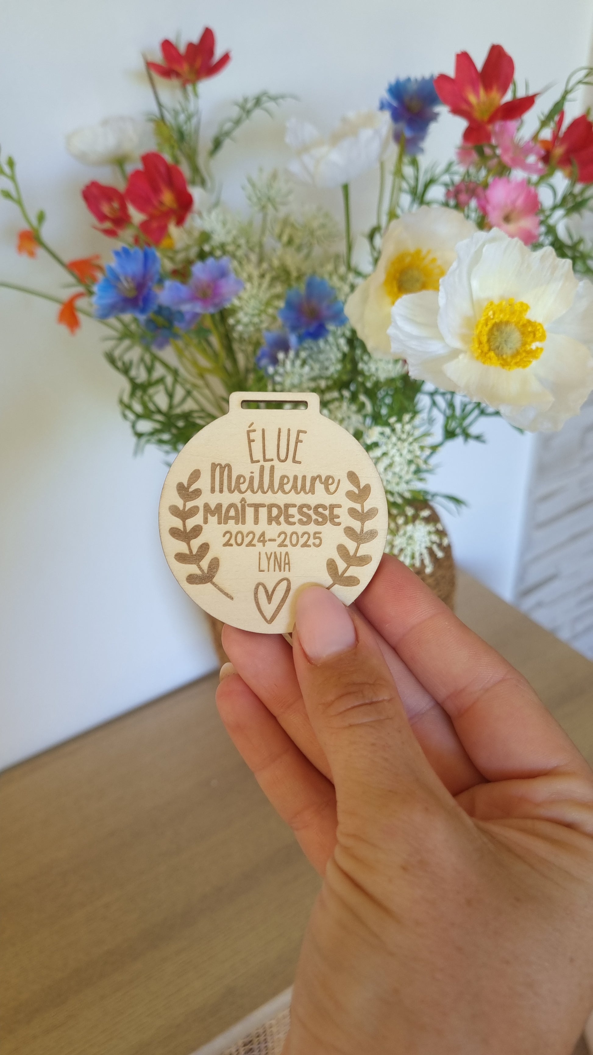 Voici une médaille en bois gravée et personnalisée, pensée comme un petit trésor à offrir à ceux qui comptent tant dans le quotidien de vos enfants.