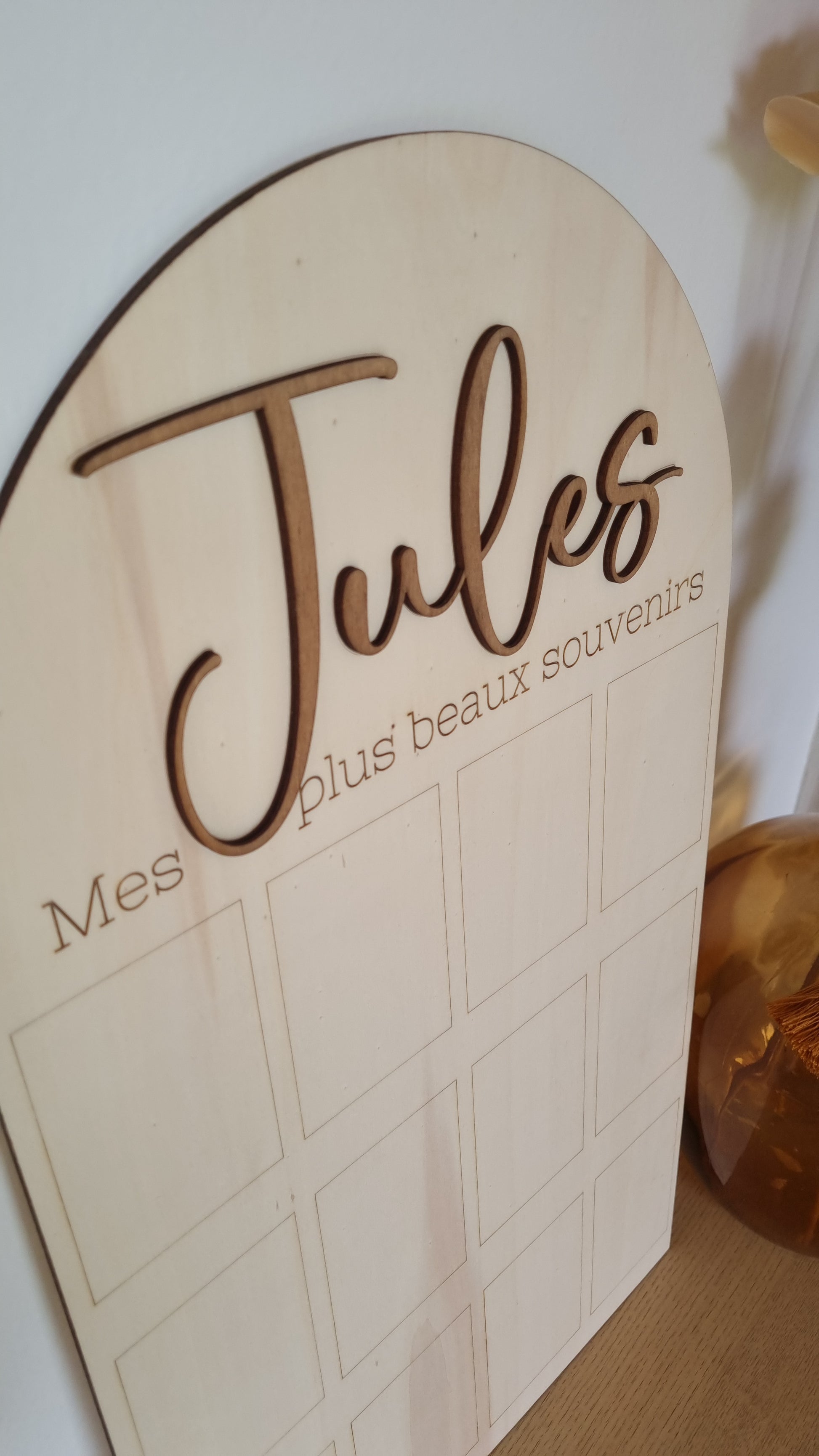 En haut du panneau : la phrase “Mes plus beaux souvenirs " gravée, le prénom de l’enfant en relief ou, si vous préférez, "Famille Durand" Nos plus beaux souvenirs pour créer une décoration à un salon ou une salle à manger....
