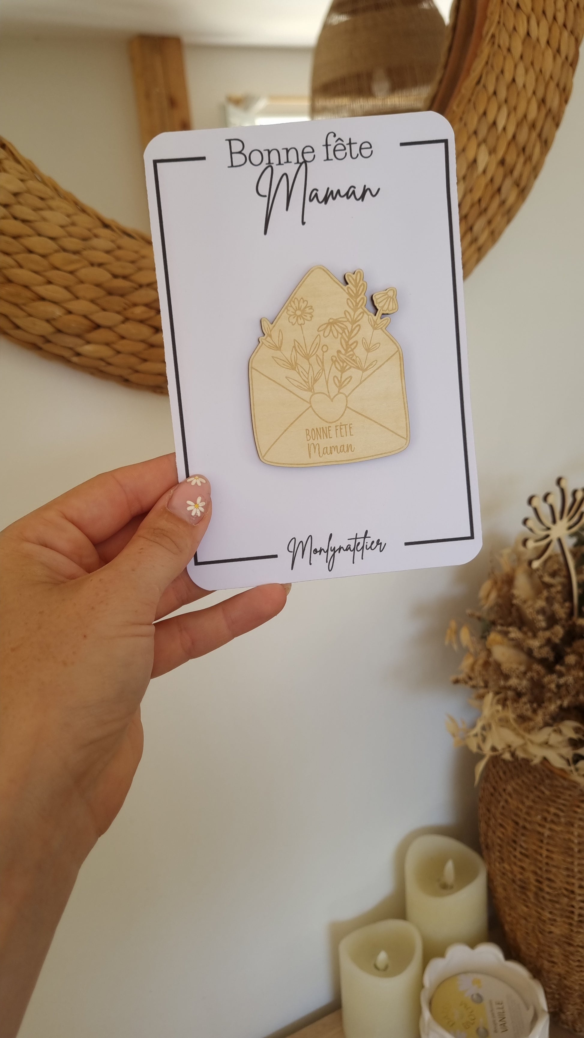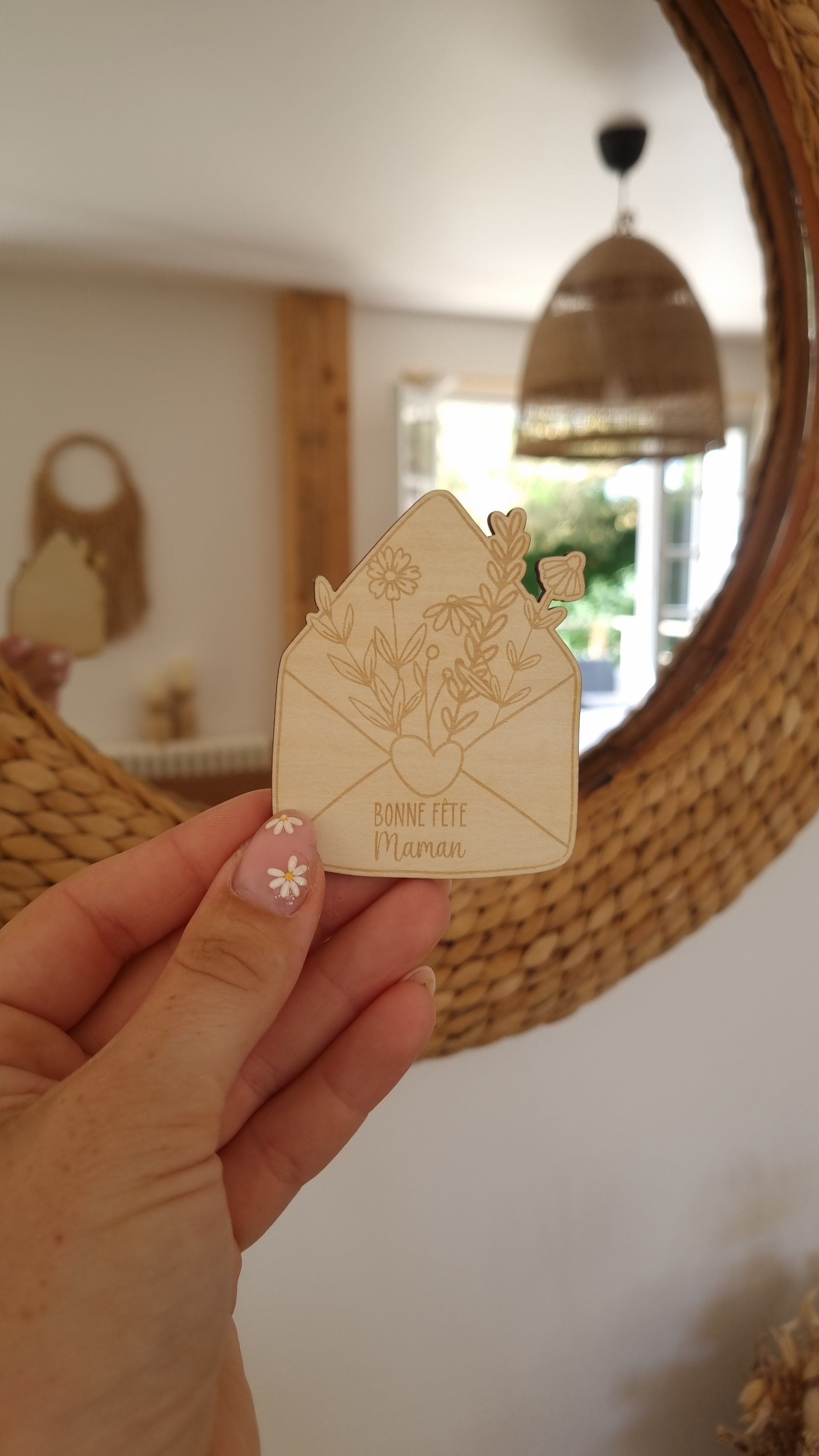 Nos aimants en bois sont gravés sur-mesure avec le message de votre choix : “Bonne fête Maman”, un prénom ou même une date spéciale.