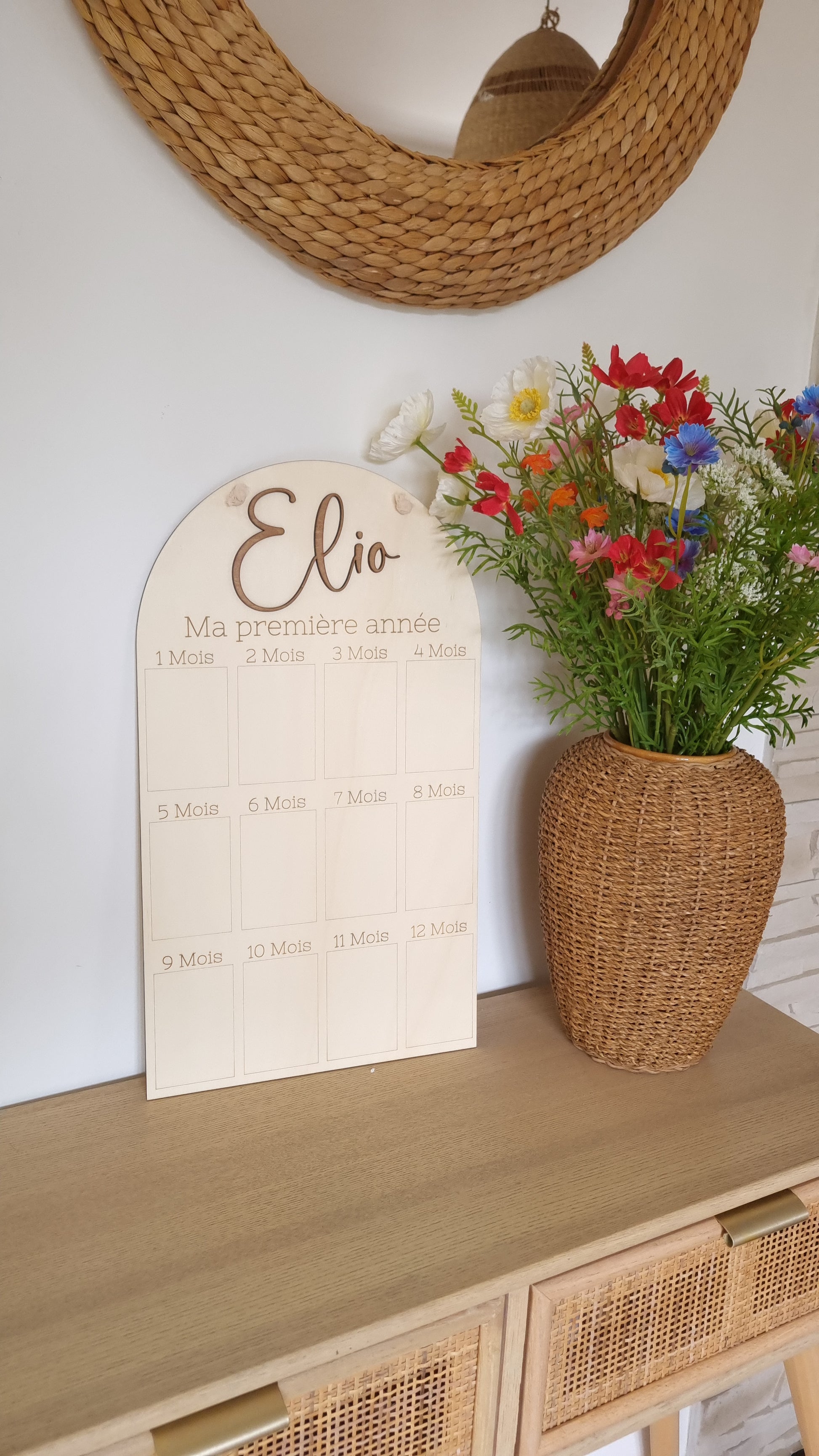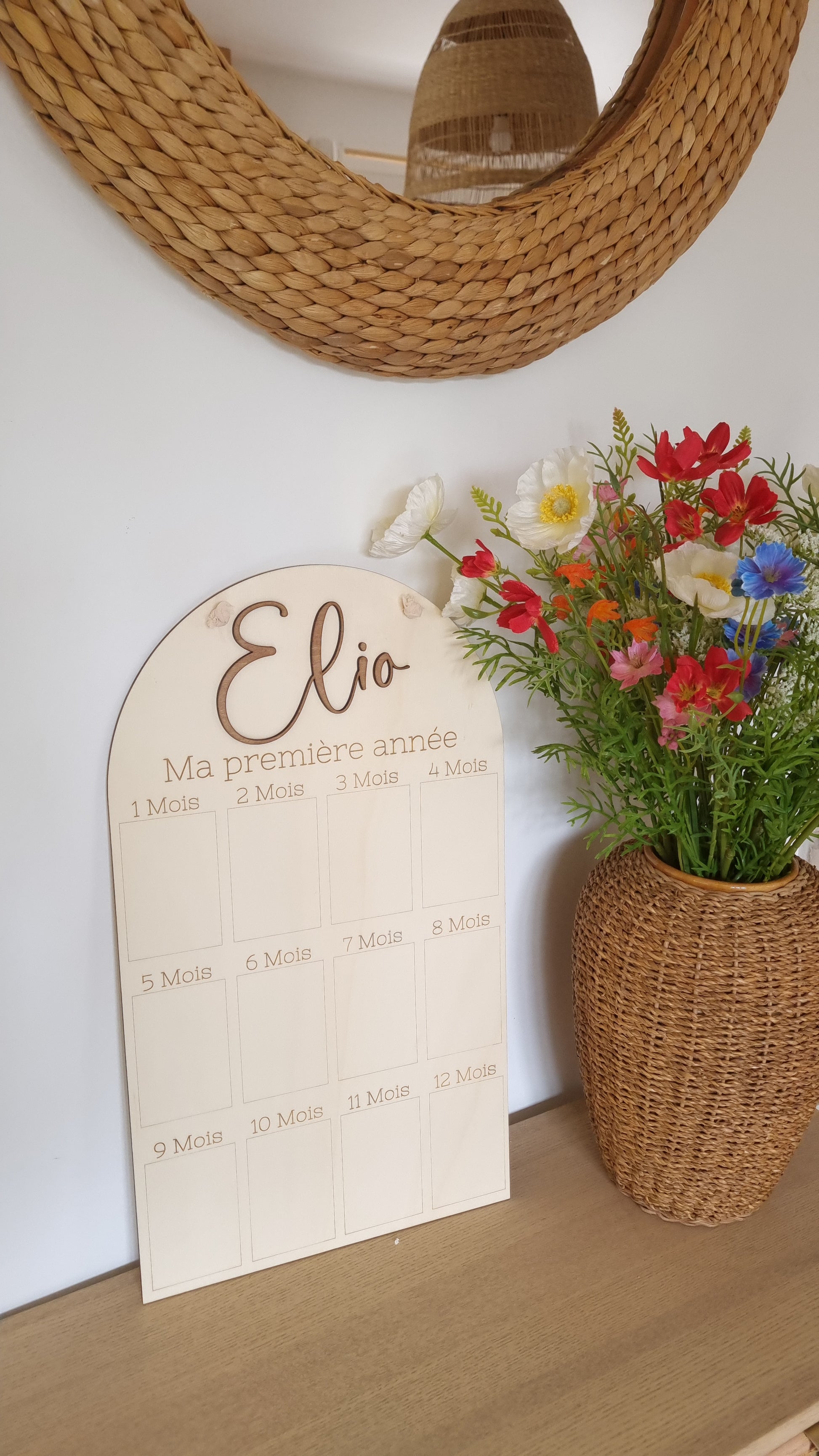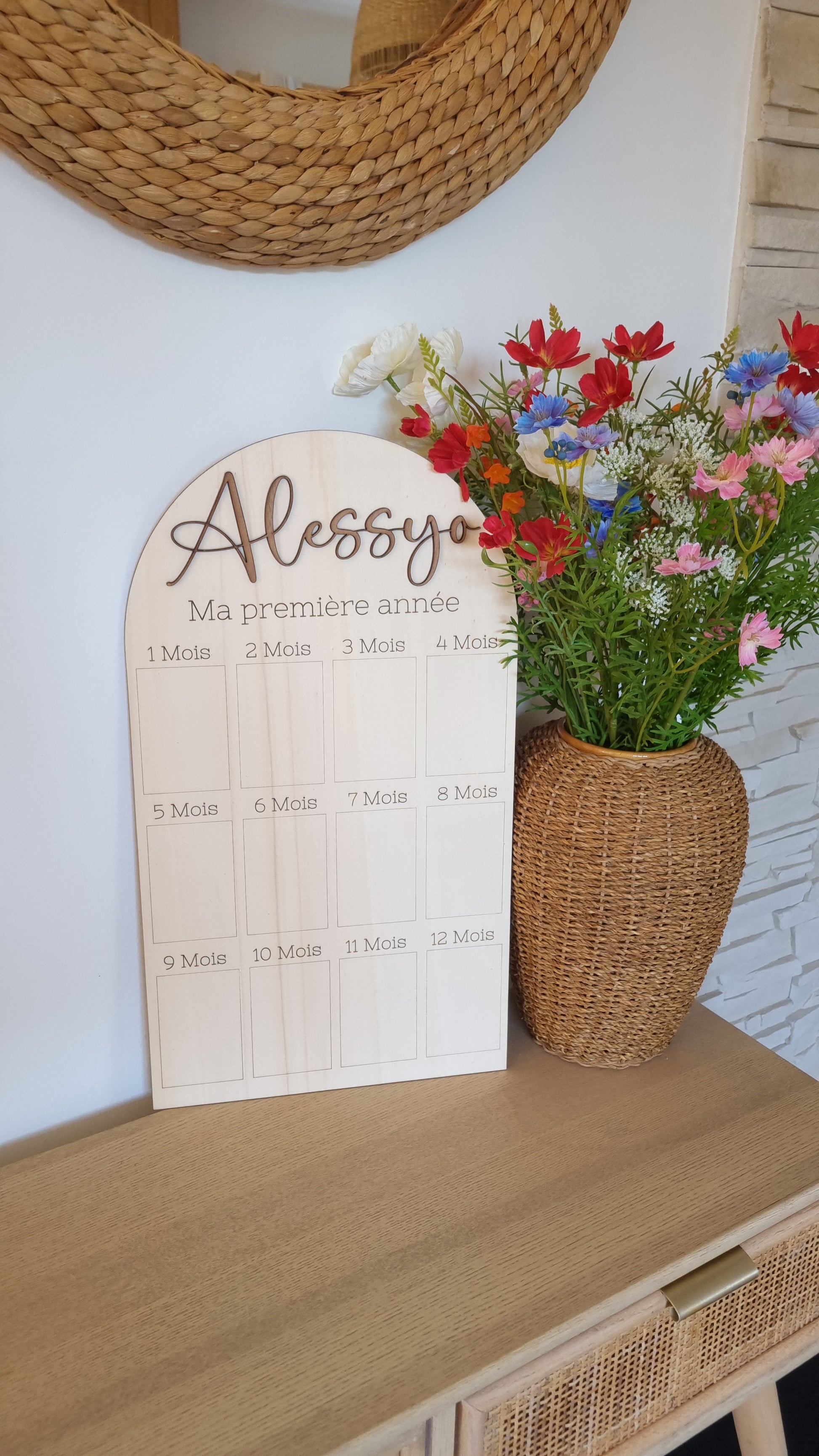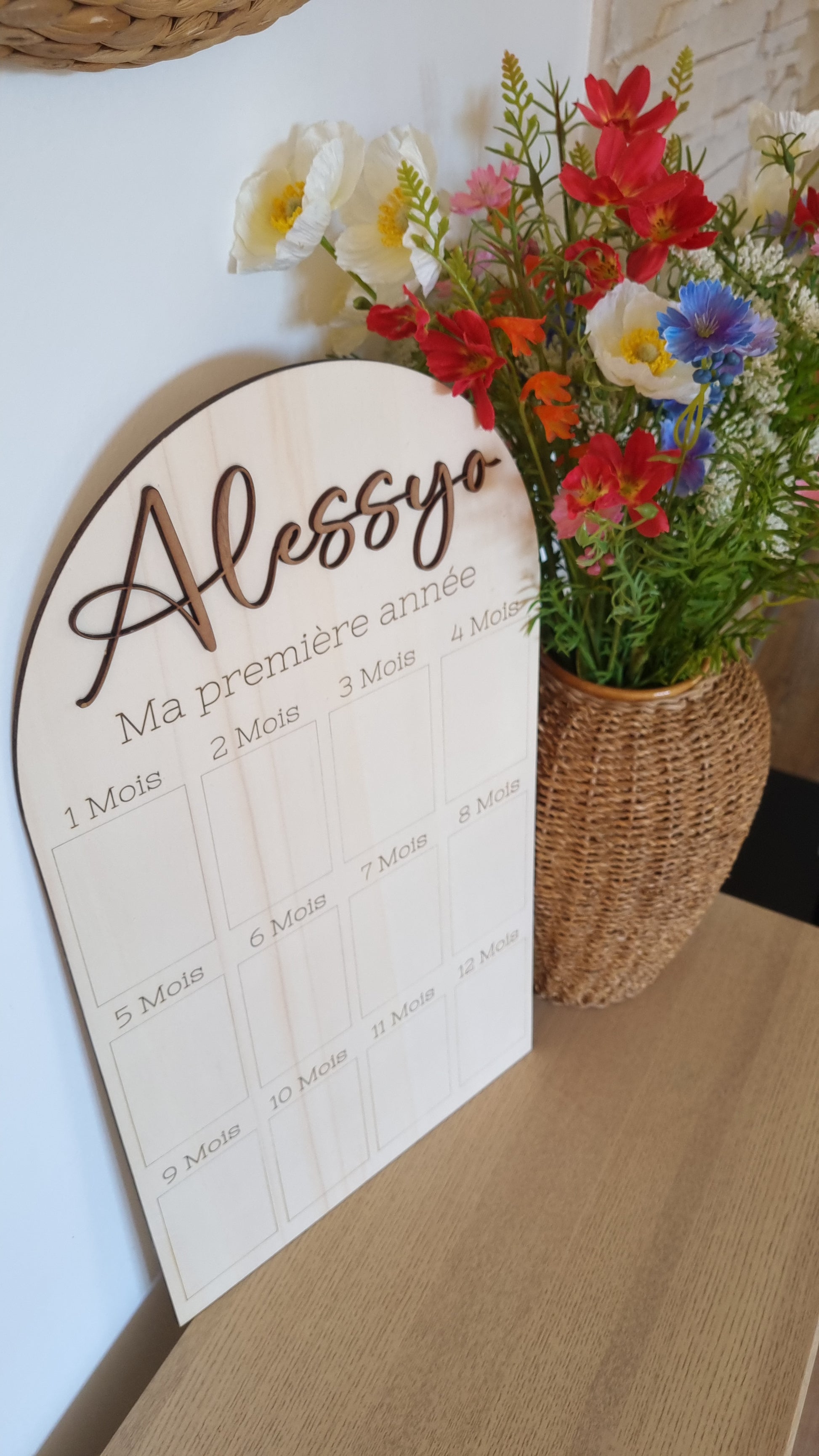 En haut du panneau : la phrase “Ma première année " gravée, le prénom de l’enfant en relief