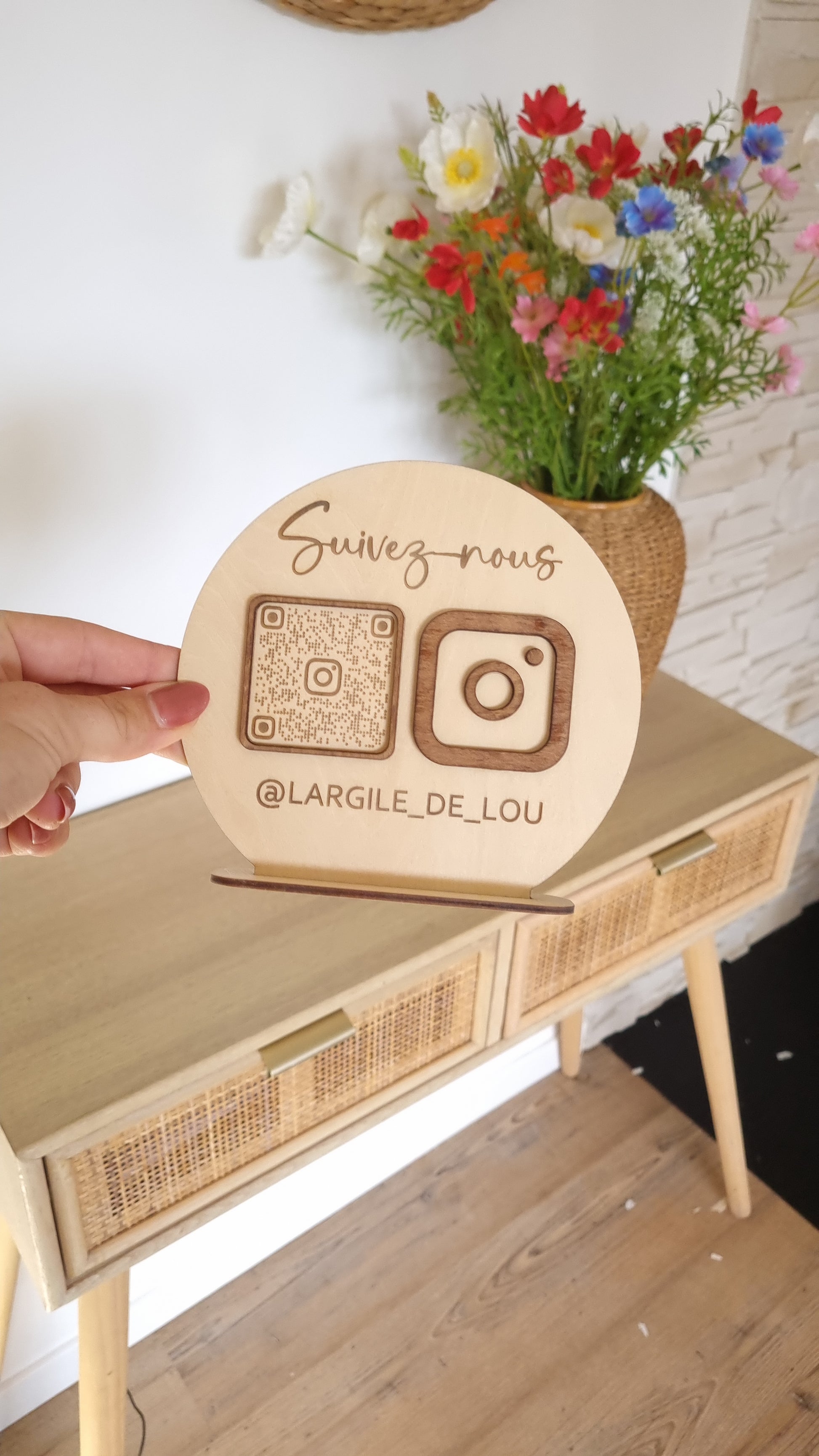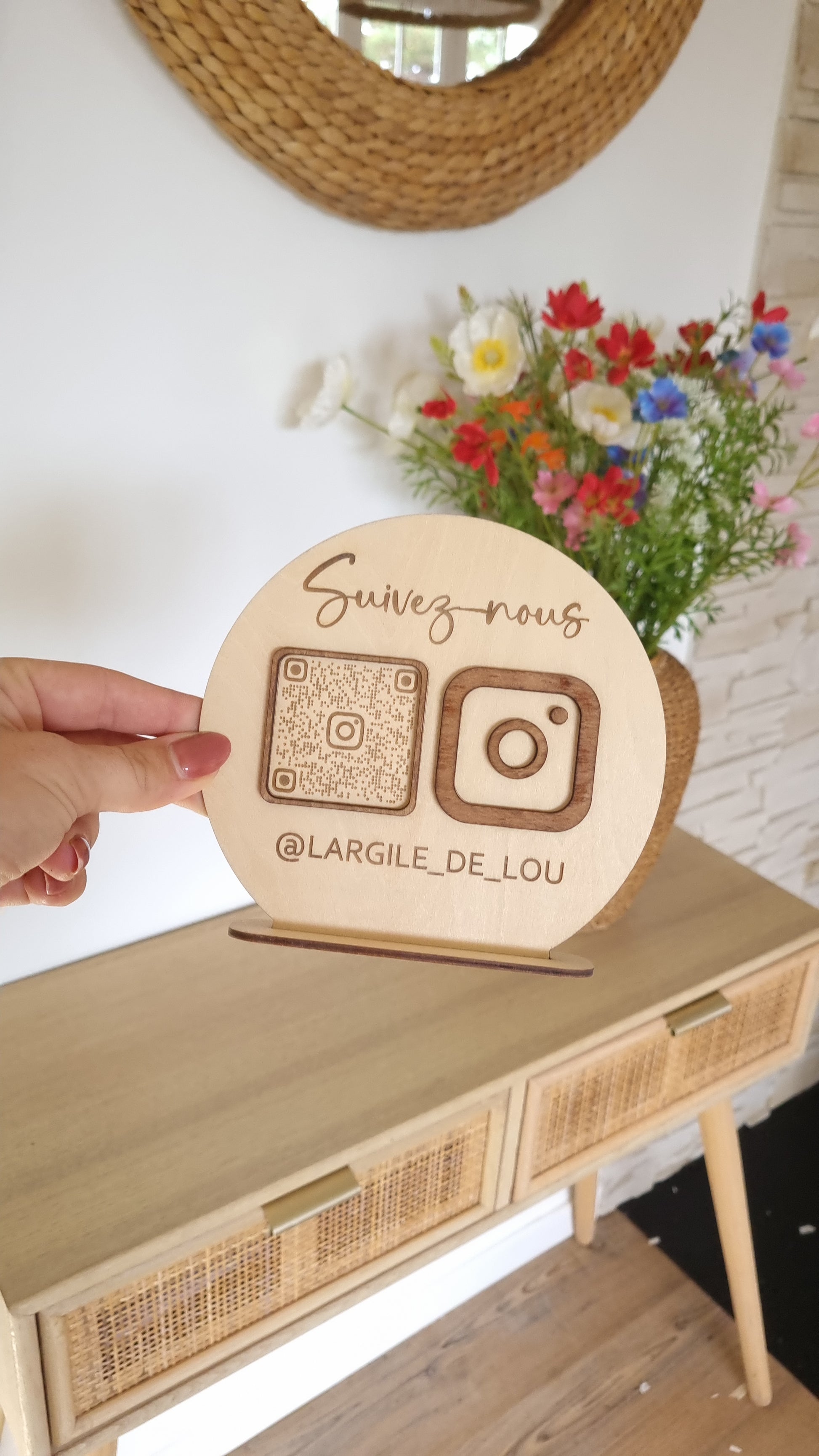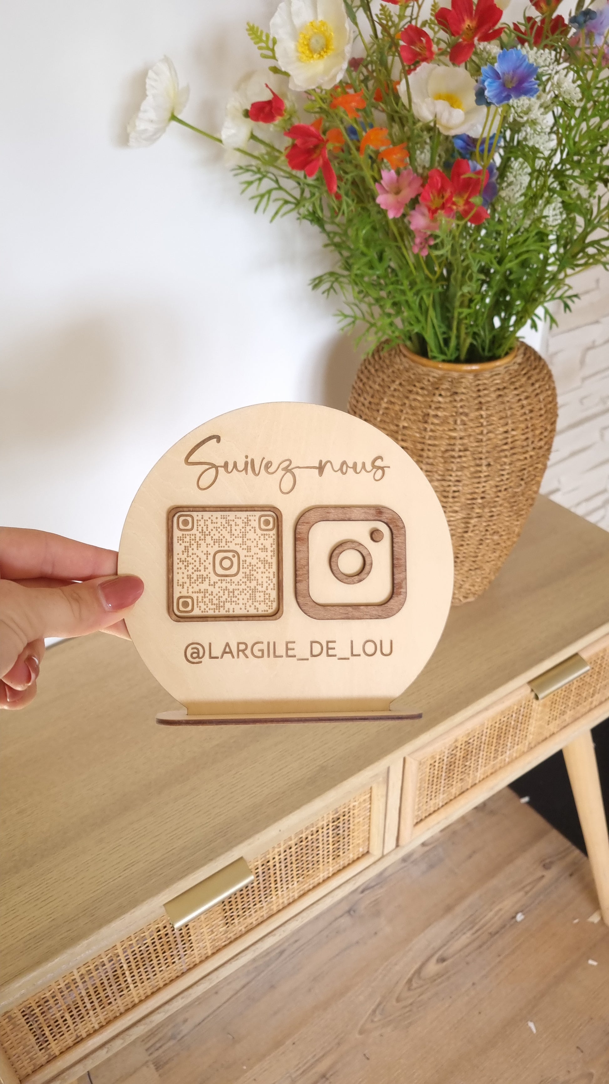 Mettez en avant votre page Instagram avec ce joli panneau en bois gravé et son QR Code intégré .