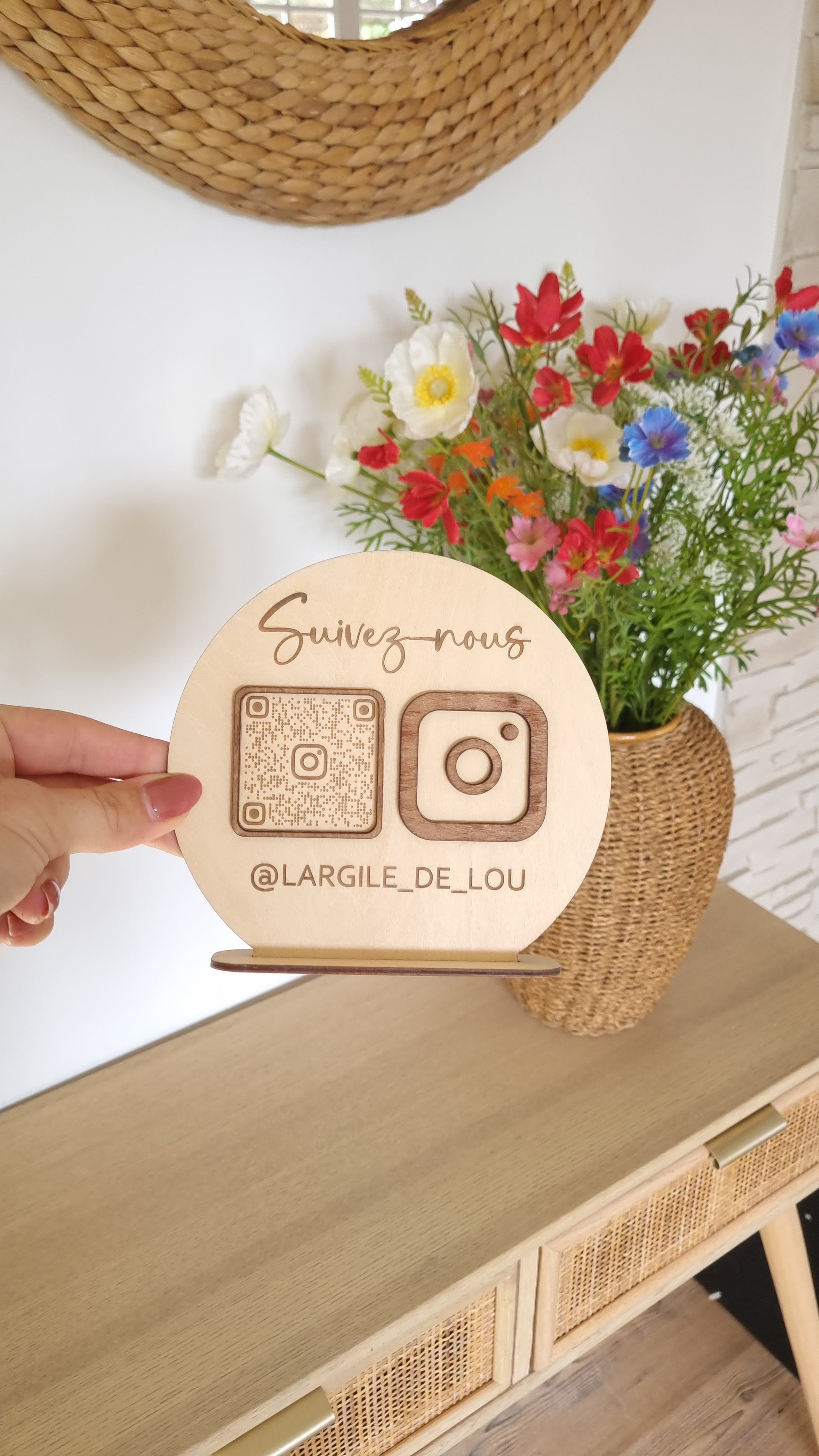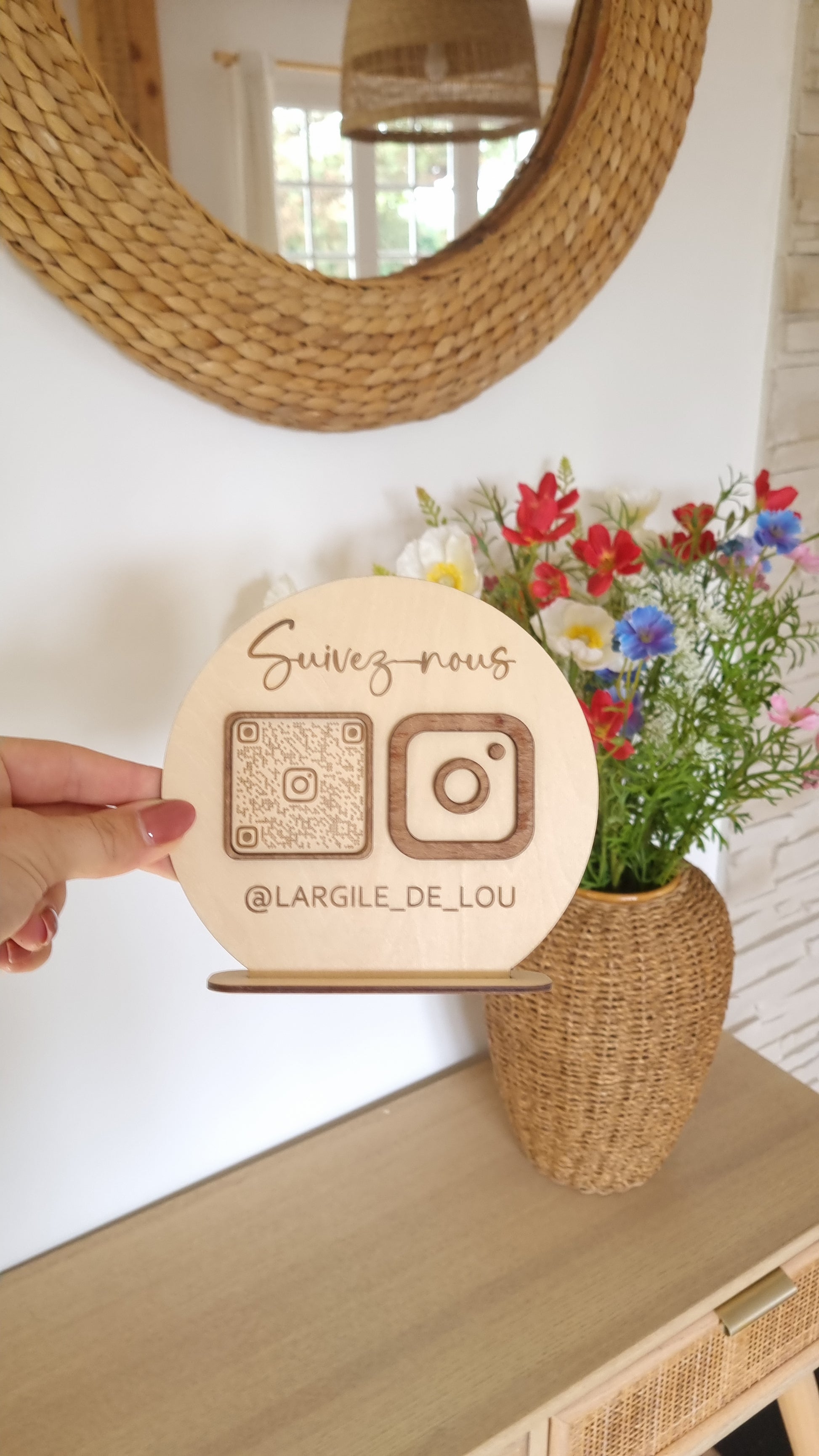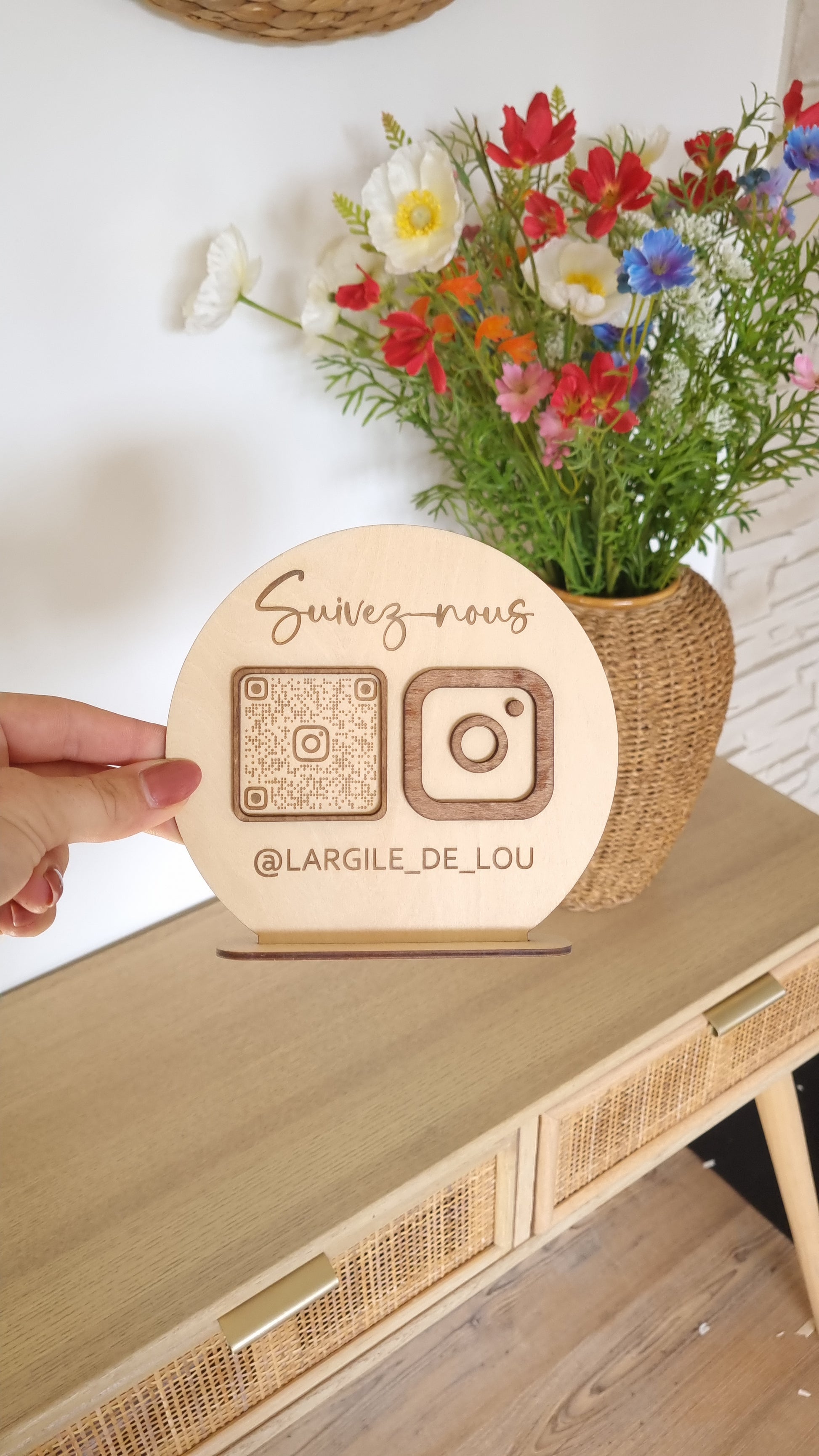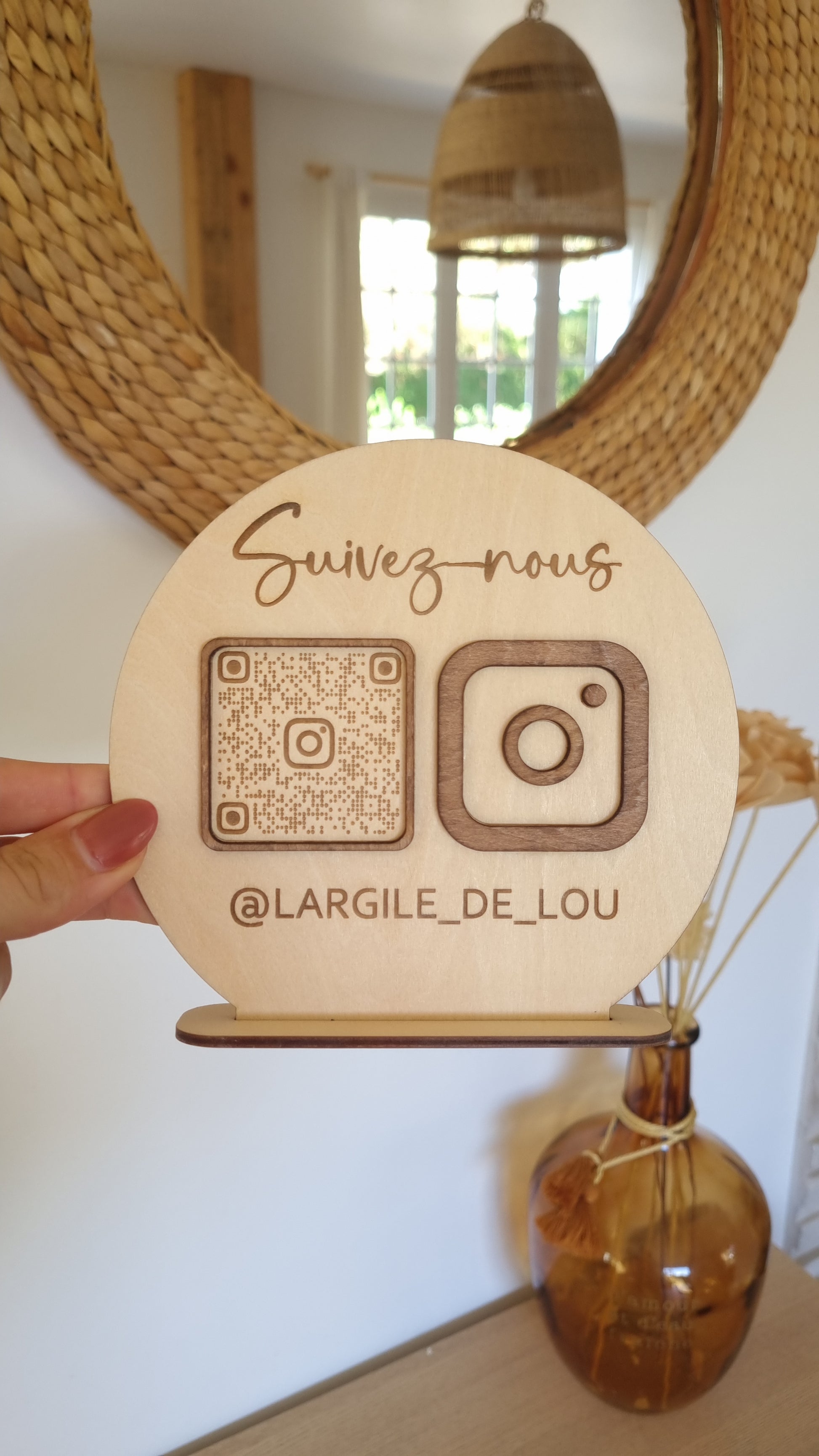 Mettez en avant votre page Instagram avec ce joli panneau en bois gravé et son QR Code intégré .