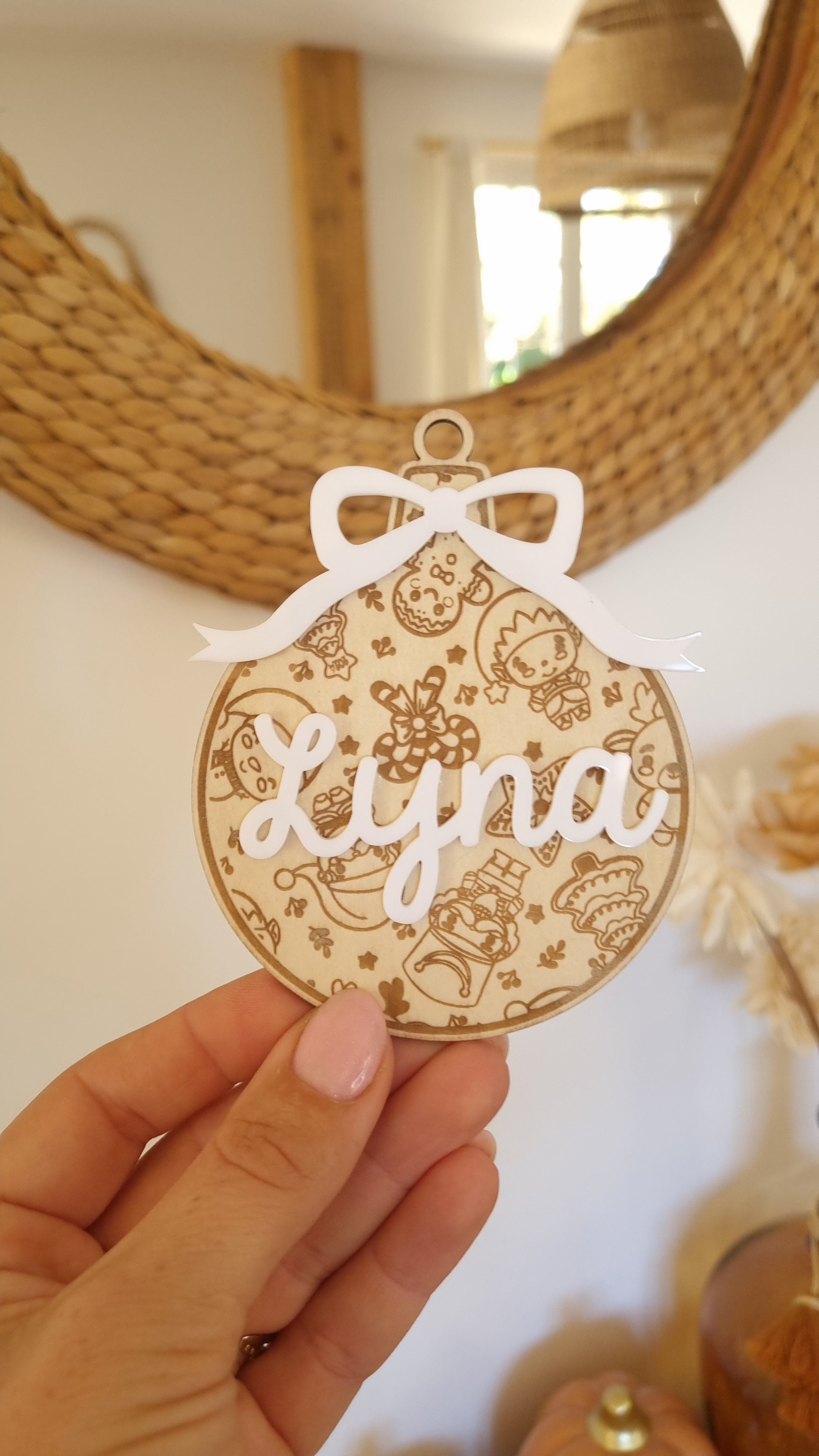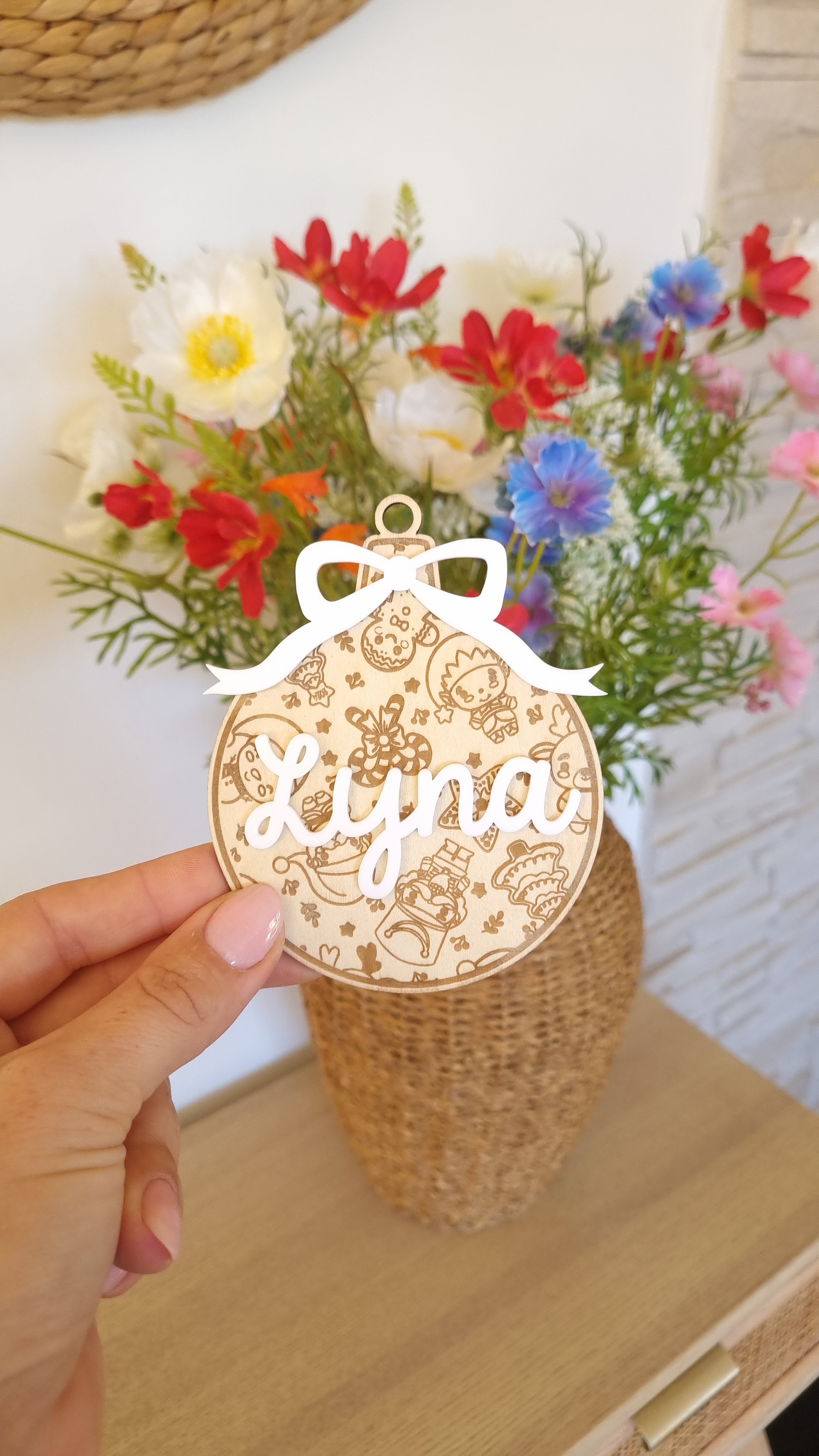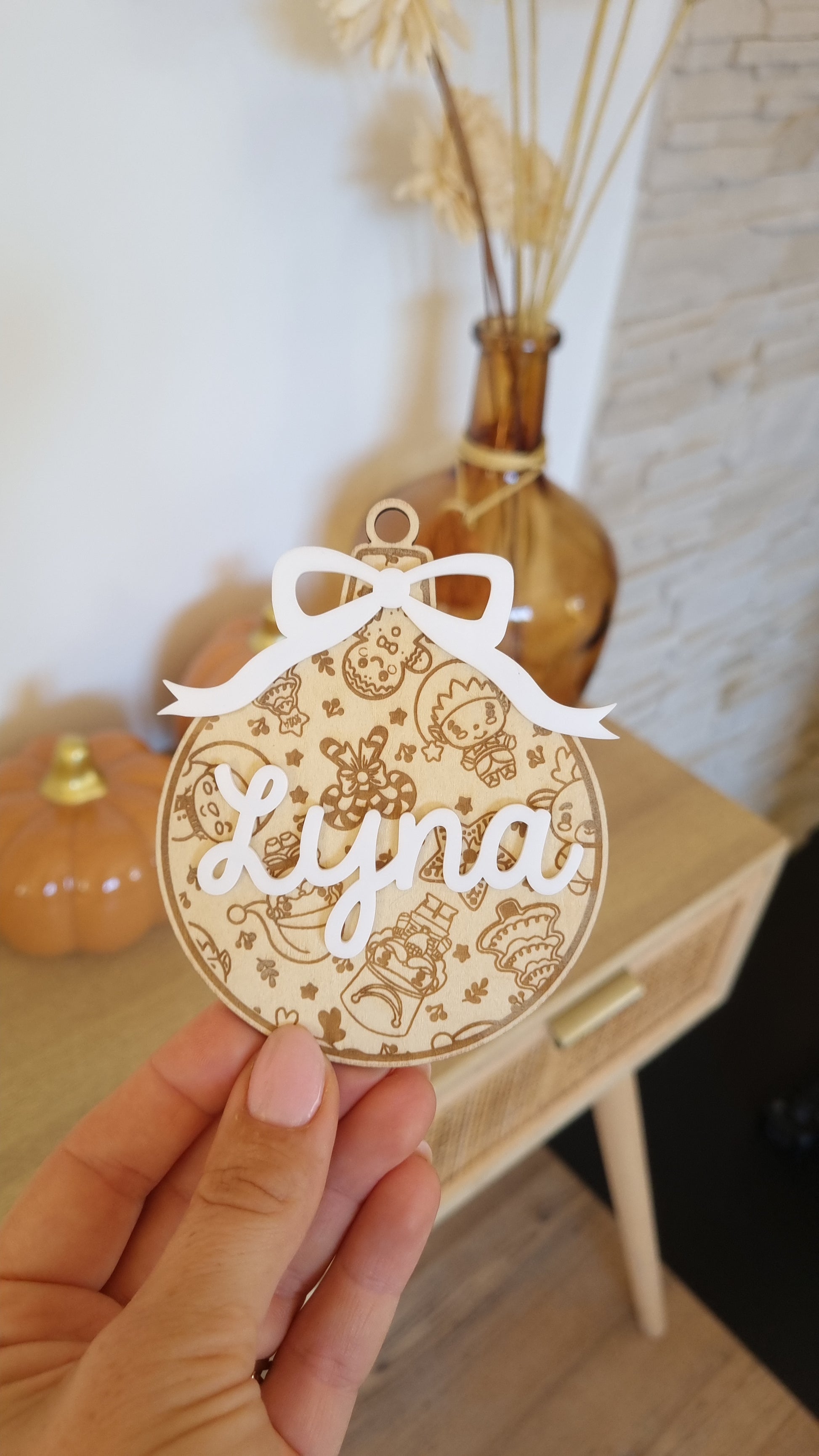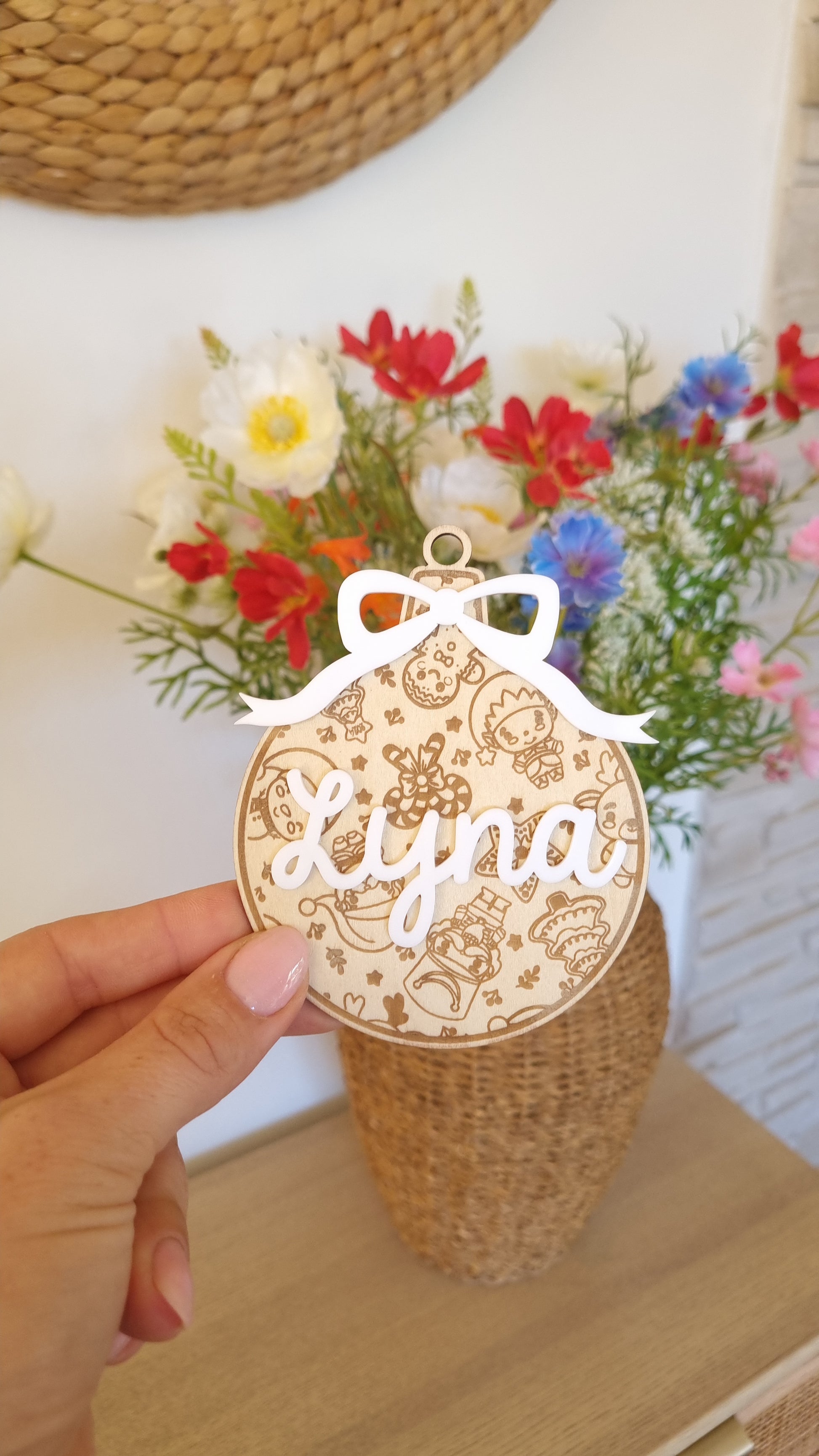 Personnalisation : prénom de l’enfant découpé en acrylique surmonté d’un joli nœud