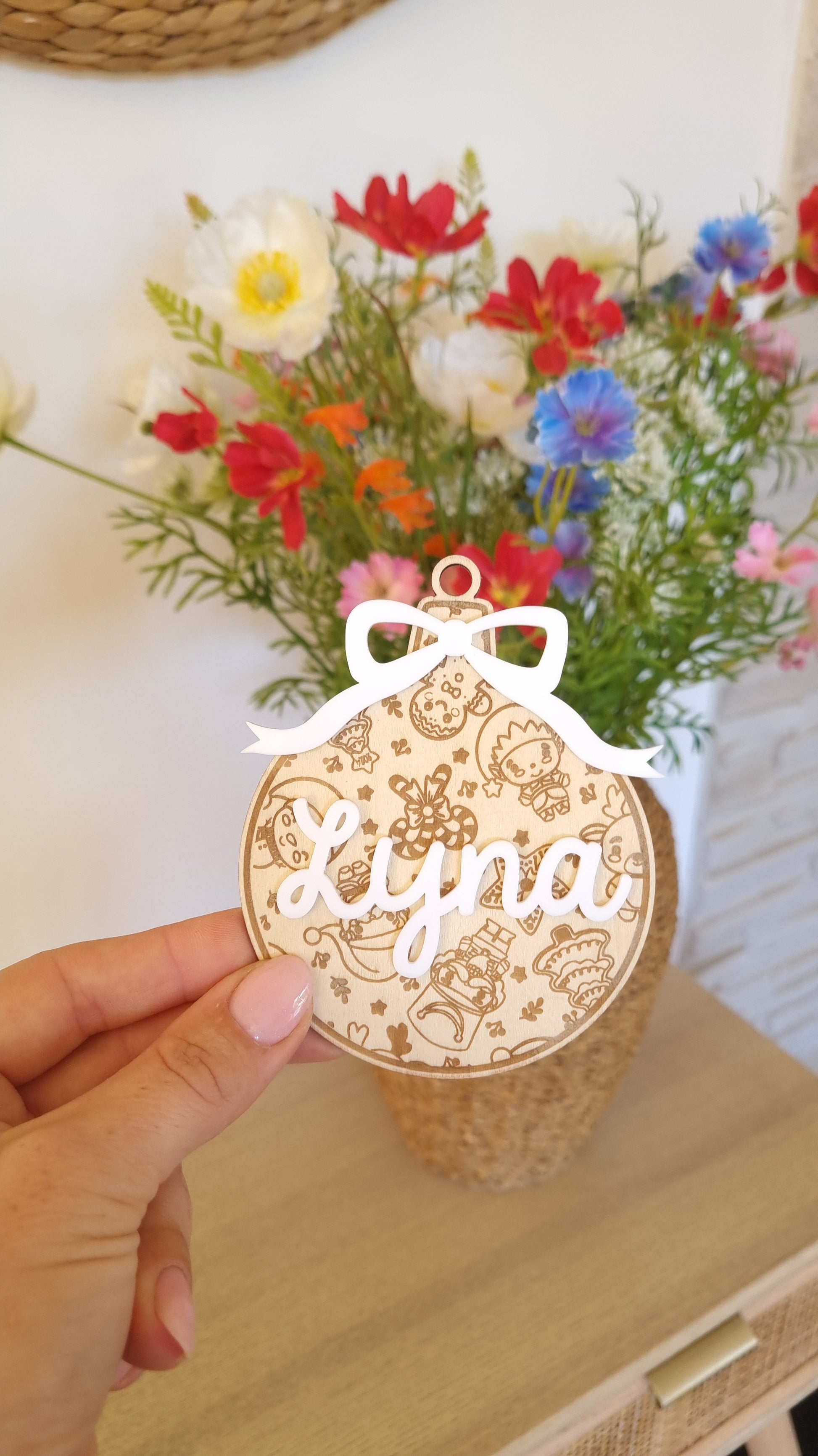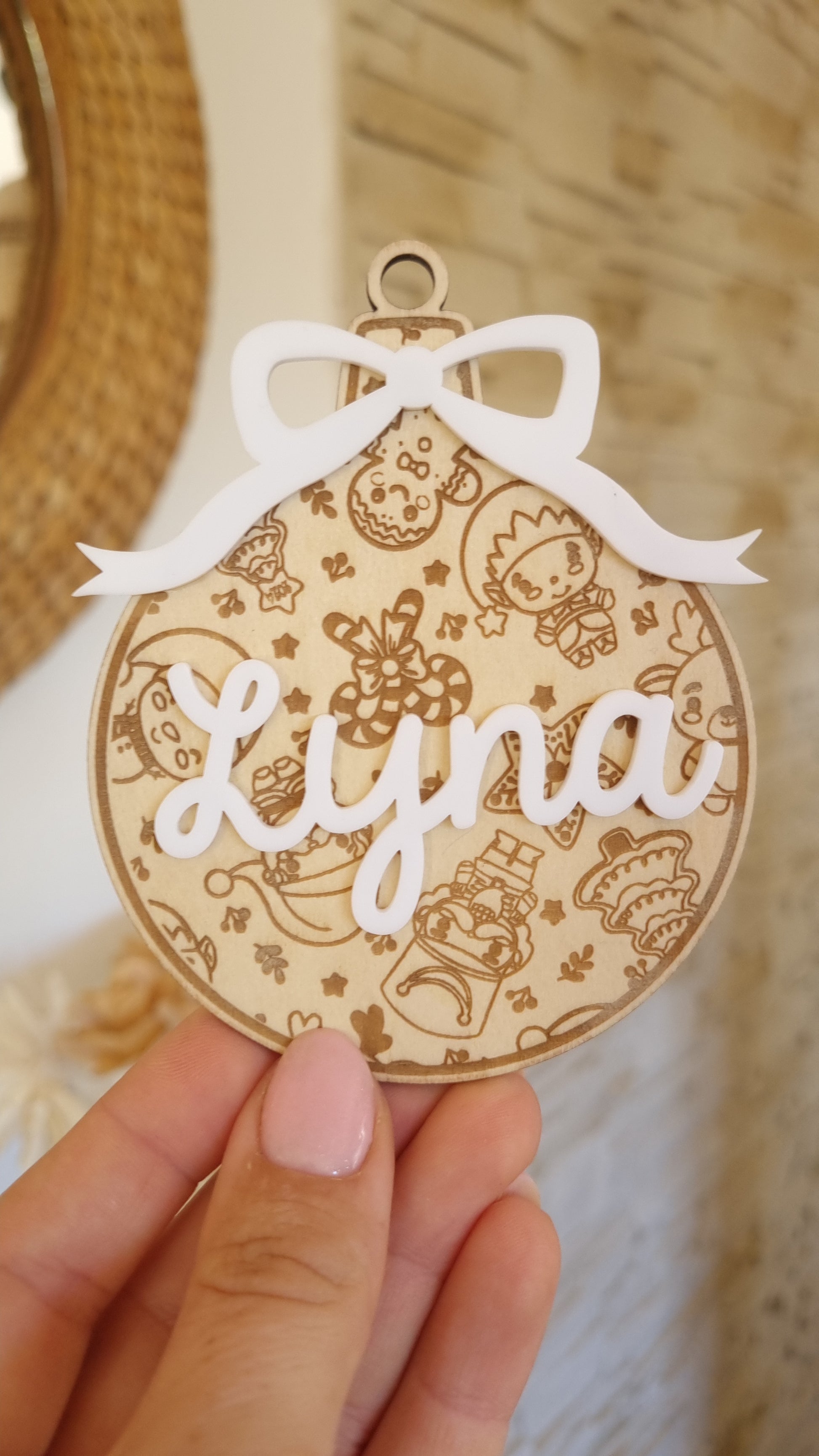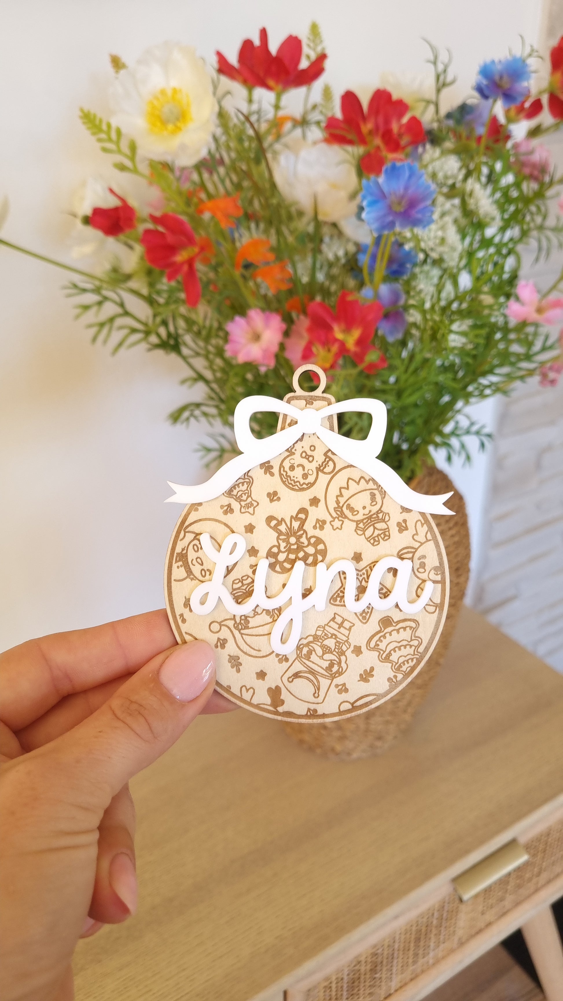 Décor gravé : petits lutins, pain d’épices, sapins, feuilles, étoiles, casse-noisettes et bonhommes de neige, pour un rendu féérique et détaillé.