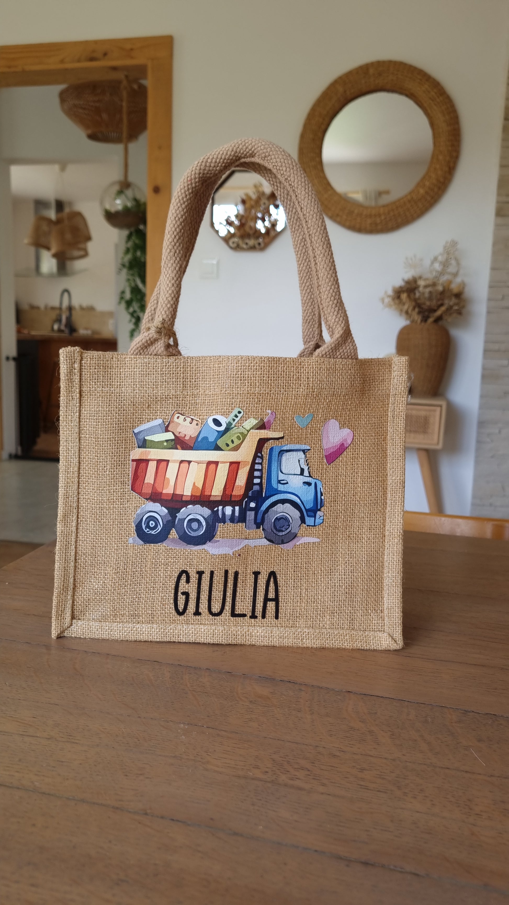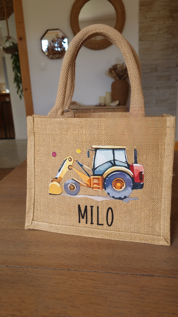 Sac en toile de jute personnalisé, idéal pour les petits. Ce sac pratique, à la fois fonctionnel, mesure 22 cm x 26 cm .